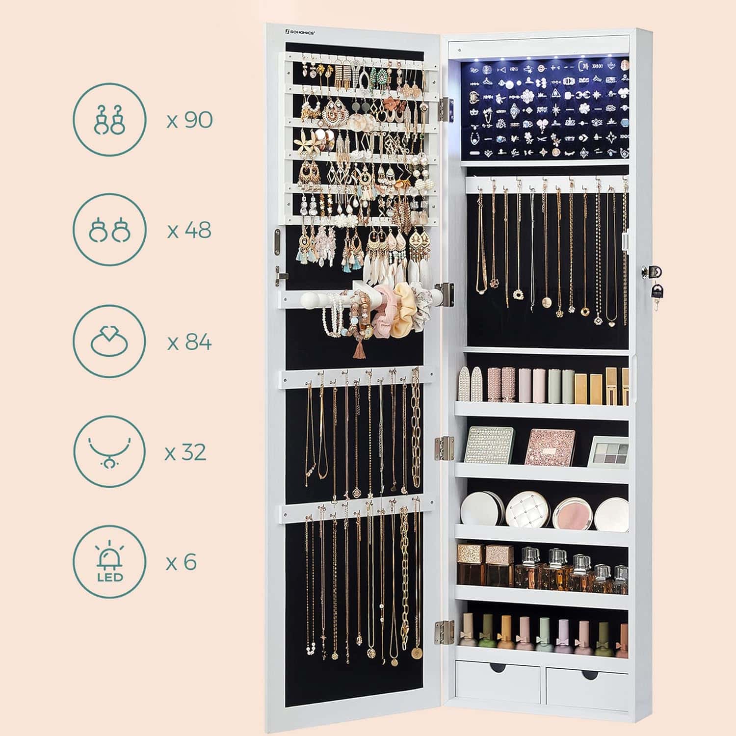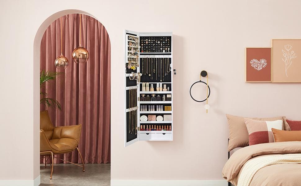 Detalii: Culoare: Alb Material: MDF (MDF (Medium Density Fiberboard), catifea, sticla Dimensiuni totale: 37 x 10 x 120 cm (L x l x a) Dimensiunea oglinzii: 27.3 x 110cm Greutate: 10kg Despre acest articol 84 de locuri pentru inele, 90 de fante pentru cercei, 48 de gauri pentru cercei, 32 de carlige pentru coliere, 5 rafturi, 2 sertare si 1 tija pentru bratari, toate intr-un singur loc.Puteti plasa pur si simplu acest dulap de bijuterii suspendat pe rama usii, folosind suporturile incluse, sau pur si simplu il puteti fixa pe un perete solid folosind suruburile furnizate; veti economisi mai mult spatiu in ambele cazuri.O structura simpla si o functionalitate ridicata se intalnesc pentru a crea acest dulap de bijuterii unic. Asadar, daruiti acest organizator de bijuterii celei mai dragi prietene sau, in schimb, tratati-va pe dumneavoastra – dati-i drumul, meritati!