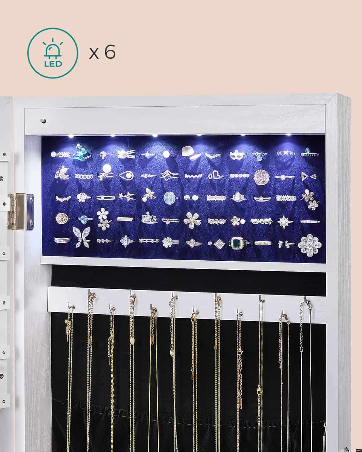 Culoare: Alb Marca: SONGMICS Material: Lemn prelucrat Dimensiunile produsului: 10D x 36.8W x 120H cm Despre acest articol Puneti-va bijuteriile in evidenta – 6 lumini LED din interiorul acestui dulap pentru bijuterii se aprind sau se sting automat la deschiderea sau inchiderea usii. Lumina va face bijuteriile sa straluceasca. Acest dulap de bijuterii este format din diferite compartimente de depozitare: 84 de spatii pentru inele, 32 de carlige pentru coliere, 48 de gauri pentru cercei, 90 de cercei, 1 bara pentru esarfe, 5 rafturi, 2 sertare.Instalare simpla: acest dulap de bijuterii suspendat poate fi agatat pe usa cu carligele gratuite sau montat pe perete cu ajutorul suruburilor furnizate.Infrumusetati-va camera cu acest dulap de bijuterii suspendat sau oferiti-l cadou prietenei dumneavoastra! Va rugam sa retineti ca dispozitivul de agatare inclus nu se va potrivi usilor cu o grosime de 14 mm sau mai mare.
