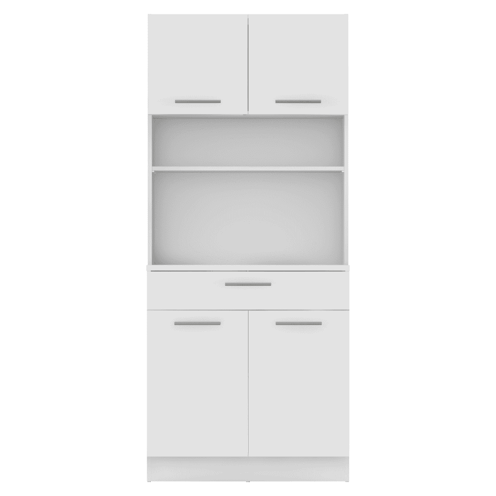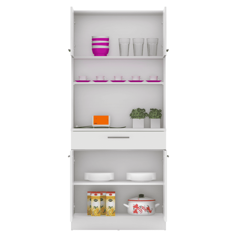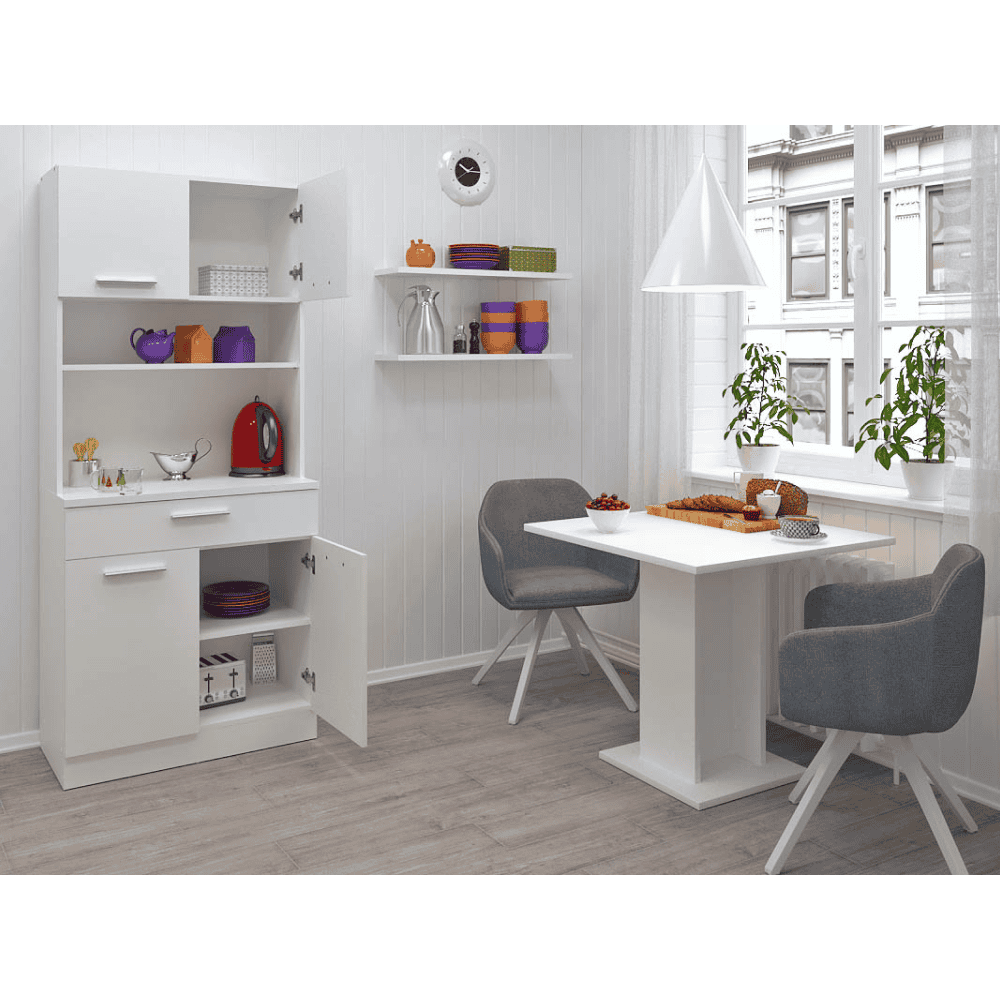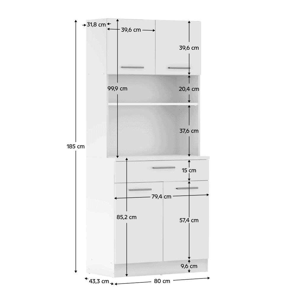 Material: DTD laminat Culoare: alb Dimensiuni (lxAxh): 80×43,3×185 cm Grosimea materialului: 1,6 cm Grosimea plăcii superioare a dulapului inferior: 2,2 cm Cu patru uşi Portanţa poliţei: 5 kg 1 sertar Dimensiuni sertar (lxh): 79,4×15 cm Portanţă sertar: 5 kg Cu mânere Material mâner: PVC Culoare mânere: argintiu Pe glisoare Practic Multifuncţional Produs slovac de calitate Recomandăm fixarea pe perete Livrat dezasamblat