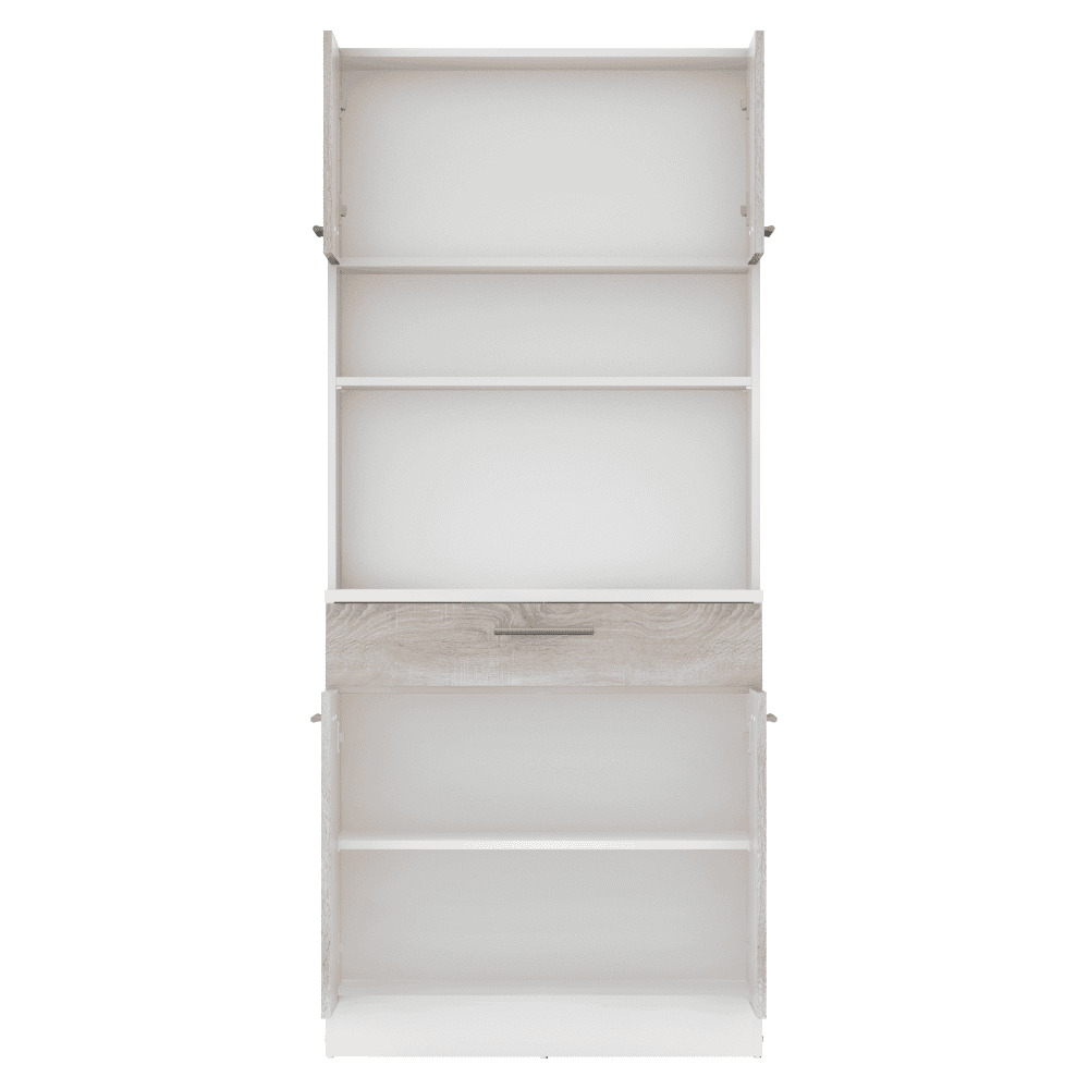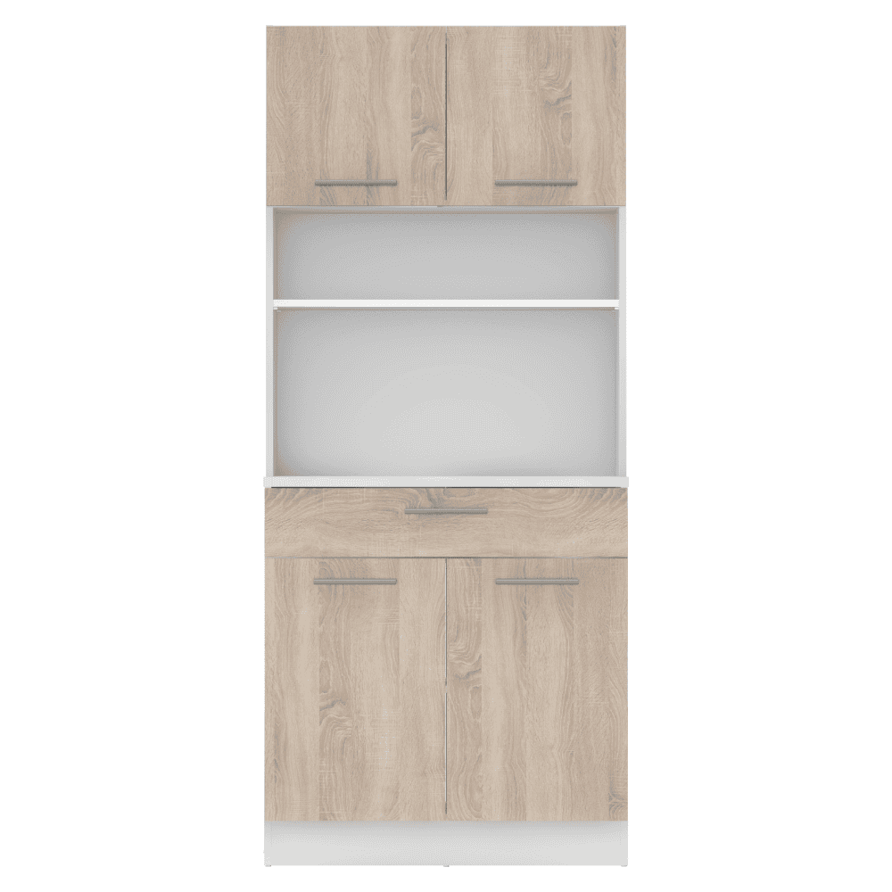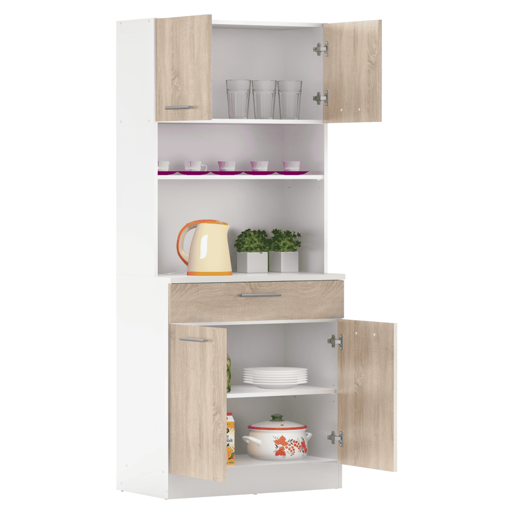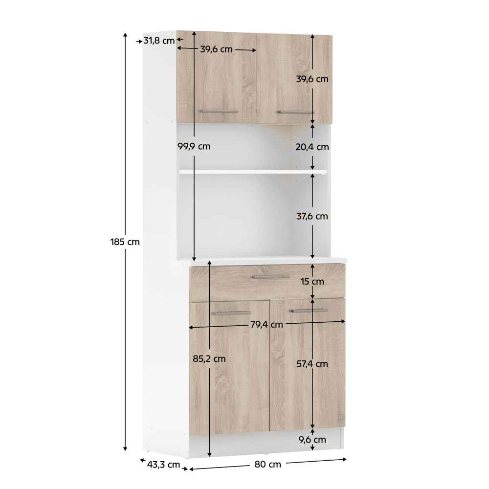 Material: DTD laminat Culoare: albă/stejar sonoma Dimensiuni (lxAxh): 80×43,3×185 cm Grosimea materialului: 1,6 cm Grosimea plăcii superioare a dulapului inferior: 2,2 cm Cu patru uşi Portanţa poliţei: 5 kg 1 sertar Dimensiuni sertar (lxh): 79,4×15 cm Portanţă sertar: 5 kg Cu mânere Material mâner: PVC Culoare mânere: argintiu Pe glisoare Practic Multifuncţional Produs slovac de calitate Recomandăm fixarea pe perete Livrat dezasamblat