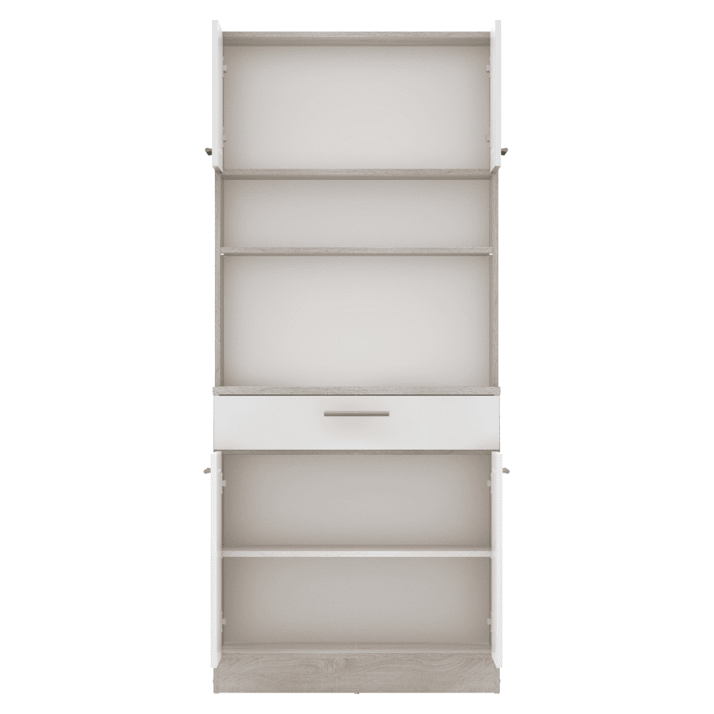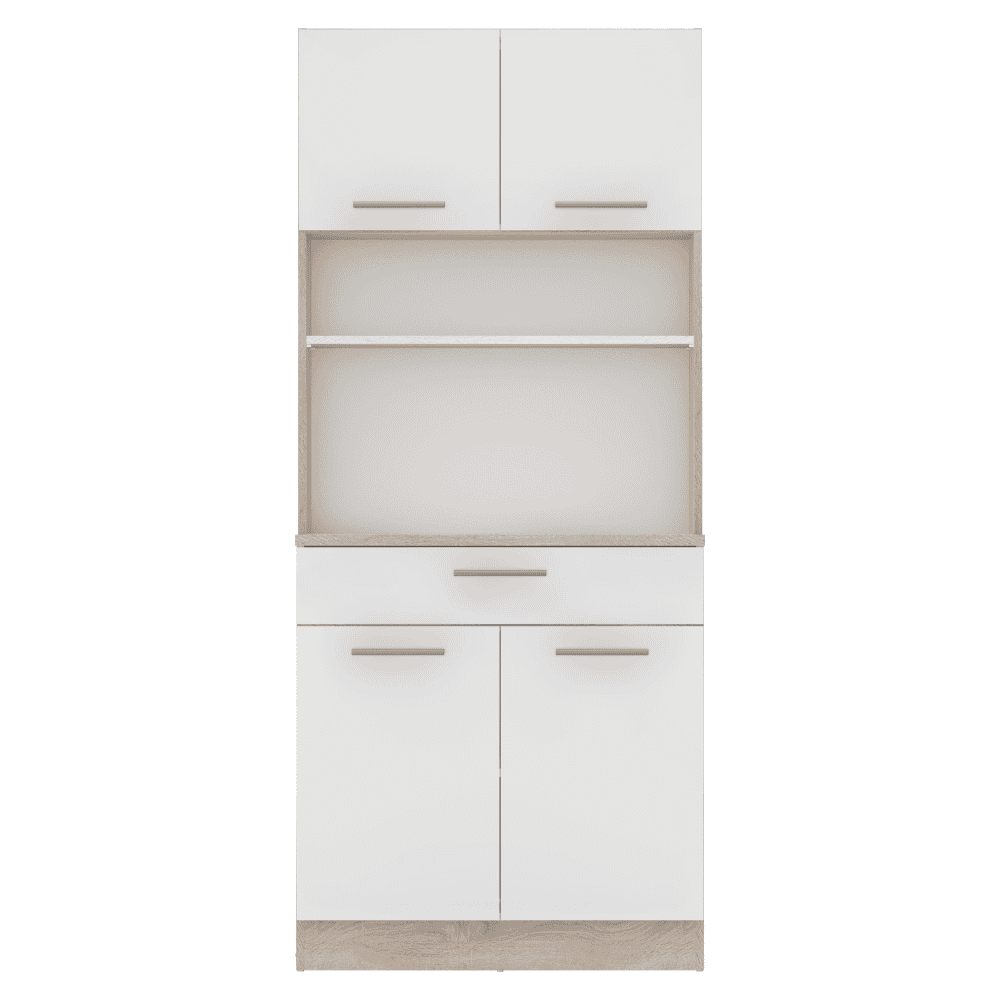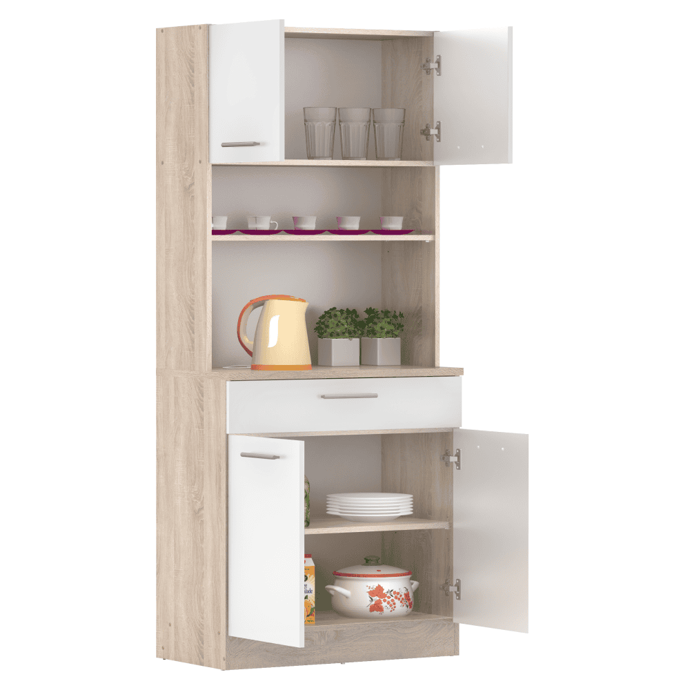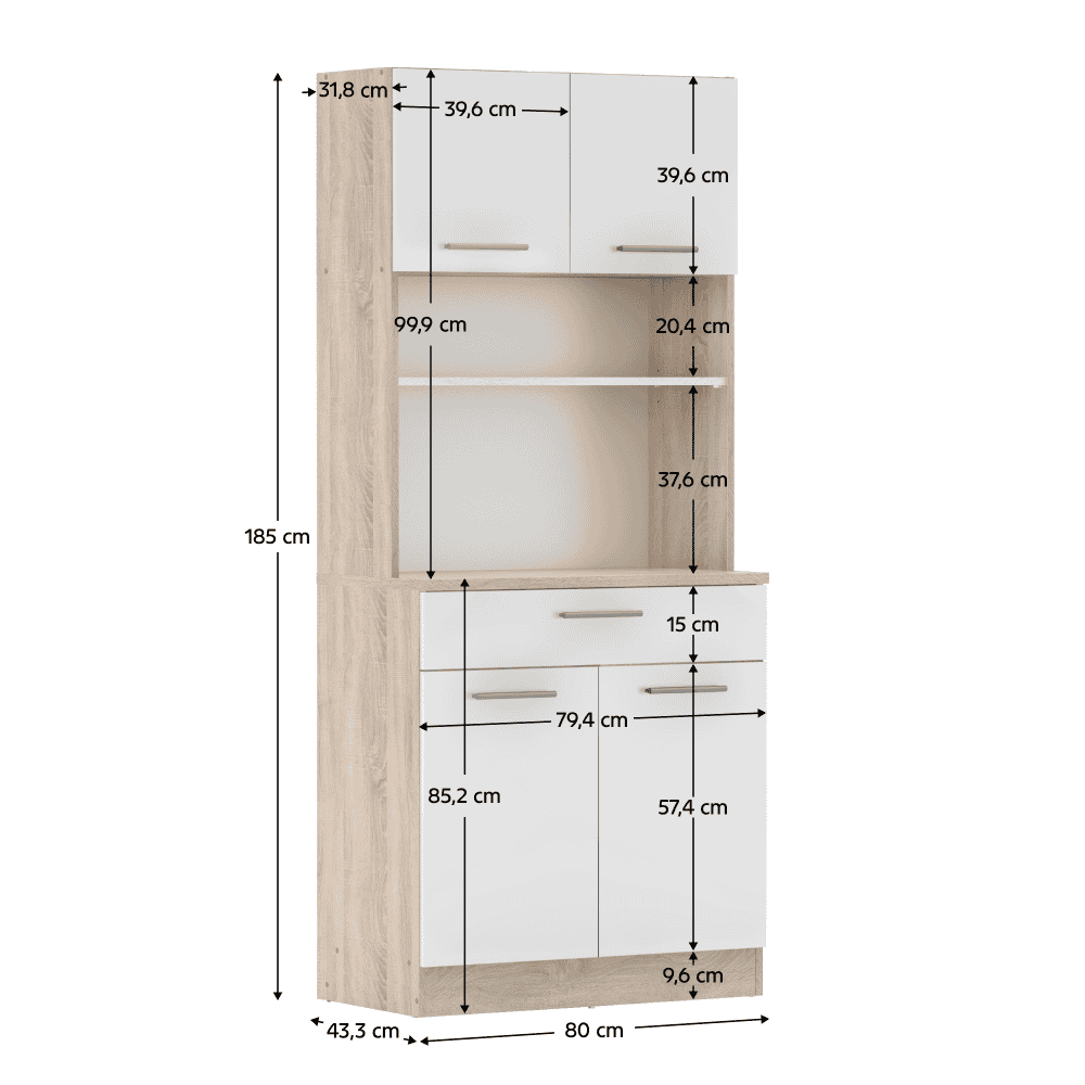 Material: DTD laminat Culori: stejar sonoma/alb Dimensiuni (lxAxh): 80×43,3×185 cm Grosimea materialului: 1,6 cm Grosimea plăcii superioare a dulapului inferior: 2,2 cm Cu patru uşi Portanţa poliţei: 5 kg 1 sertar Dimensiuni sertar (lxh): 79,4×15 cm Portanţă sertar: 5 kg Cu mânere Material mâner: PVC Culoare mânere: argintiu Pe glisoare Practic Multifuncţional Produs slovac de calitate Recomandăm fixarea pe perete Livrat dezasamblat