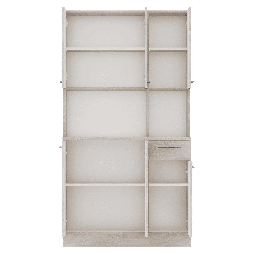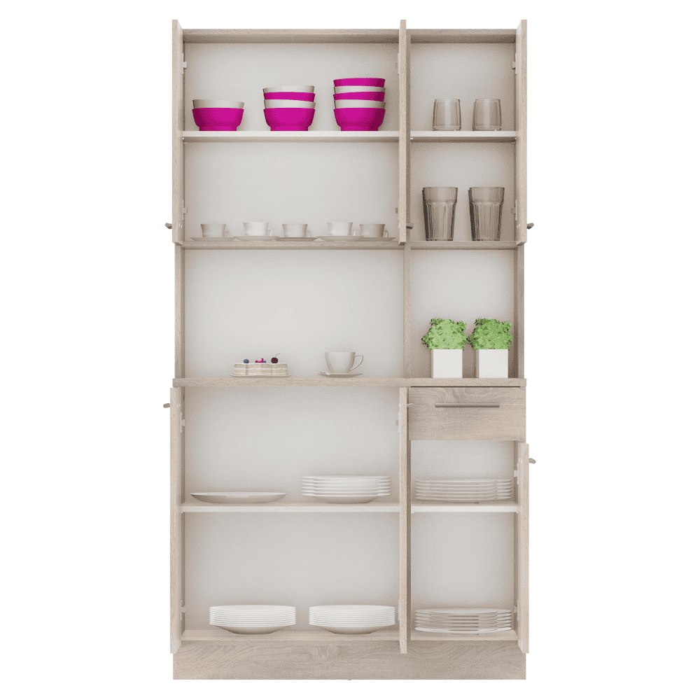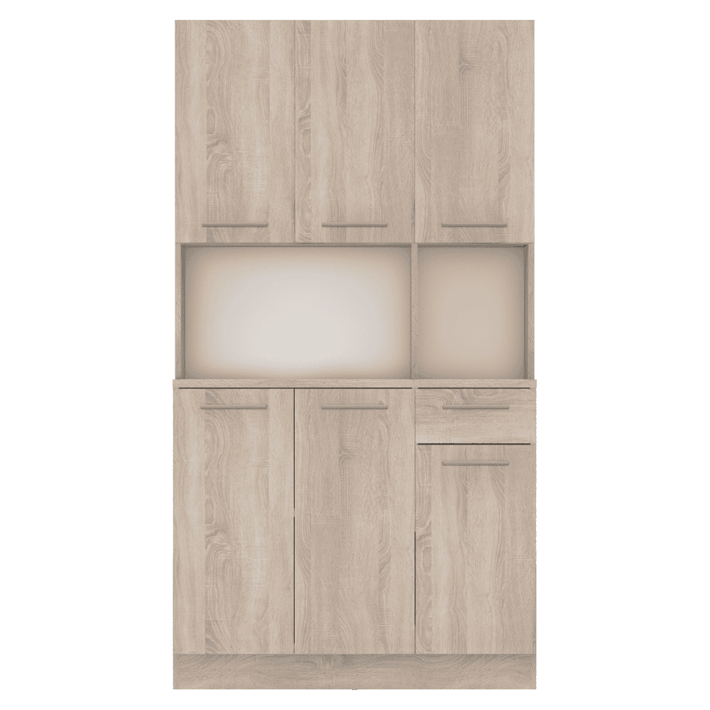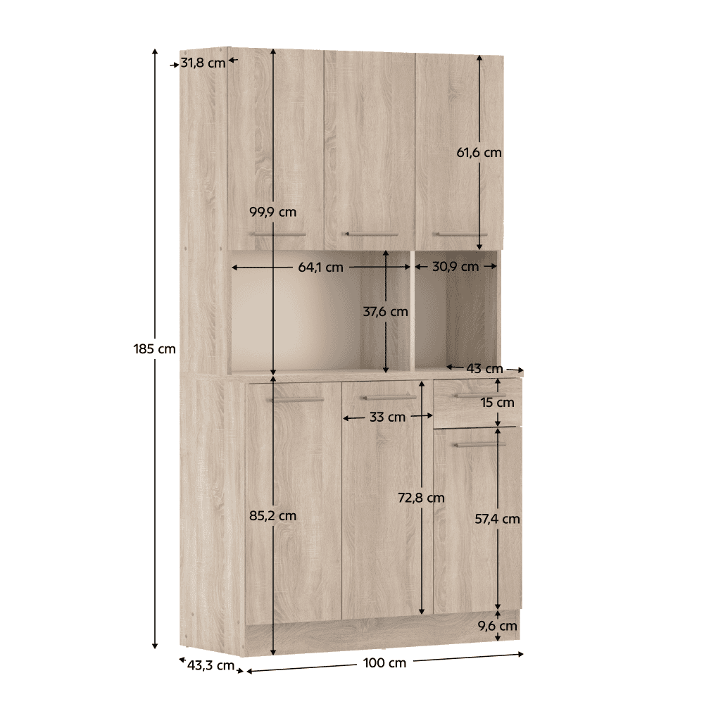 Material: DTD laminat Culoare: stejar sonoma Dimensiuni (lxAxh): 100×43,3×185 cm Grosimea materialului: 1,6 cm Grosimea plăcii superioare a dulapului inferior: 2,2 cm Cu şase uşi Cu poliţe Portanţa poliţei: 5 kg 1 sertar Dimensiuni sertar (lxh): 30,9×15 cm Cu mânere Material mânere: PVC Culoare mânere: argintiu Pe glisoare Practic Multifuncţional Produs slovac de calitate Recomandăm fixarea pe perete Livrat dezasamblat