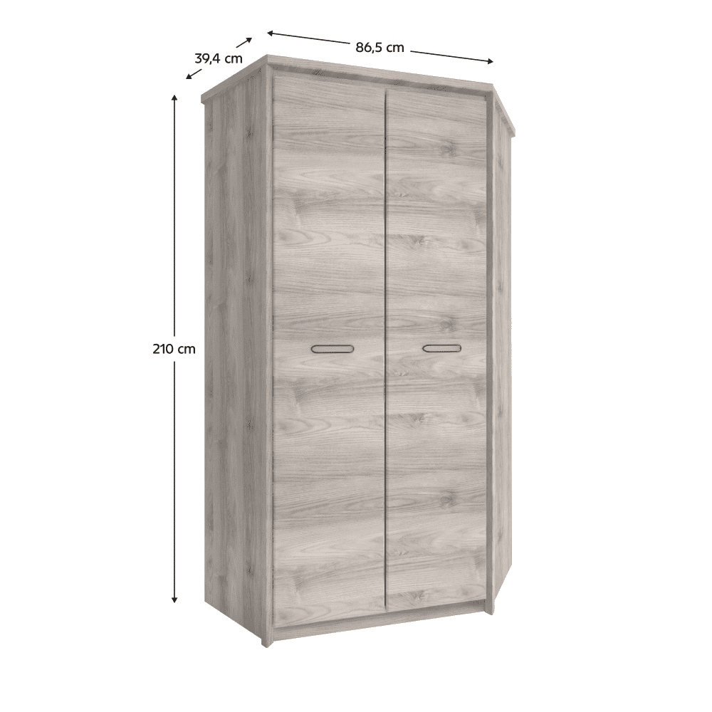 Material: PAL melaminat Culoare: castan Nairobi Dimensiuni (LxAxÎ): 86,5×39,4×210 cm Grosime material: 1,6-3,2 cm Mânere metalice Culoarea mânerelor: neagră Picioare din plastic Spaţiu de depozitare Cu două uşi Zonă cu rafturi Capacitate de încărcare a raftului: 5 kg Bară pentru umeraşe Capacitatea de încărcare a barei pentru umeraşe: 15 kg Dulap de colţ Design modern Livrat dezasamblat