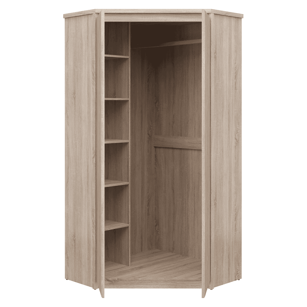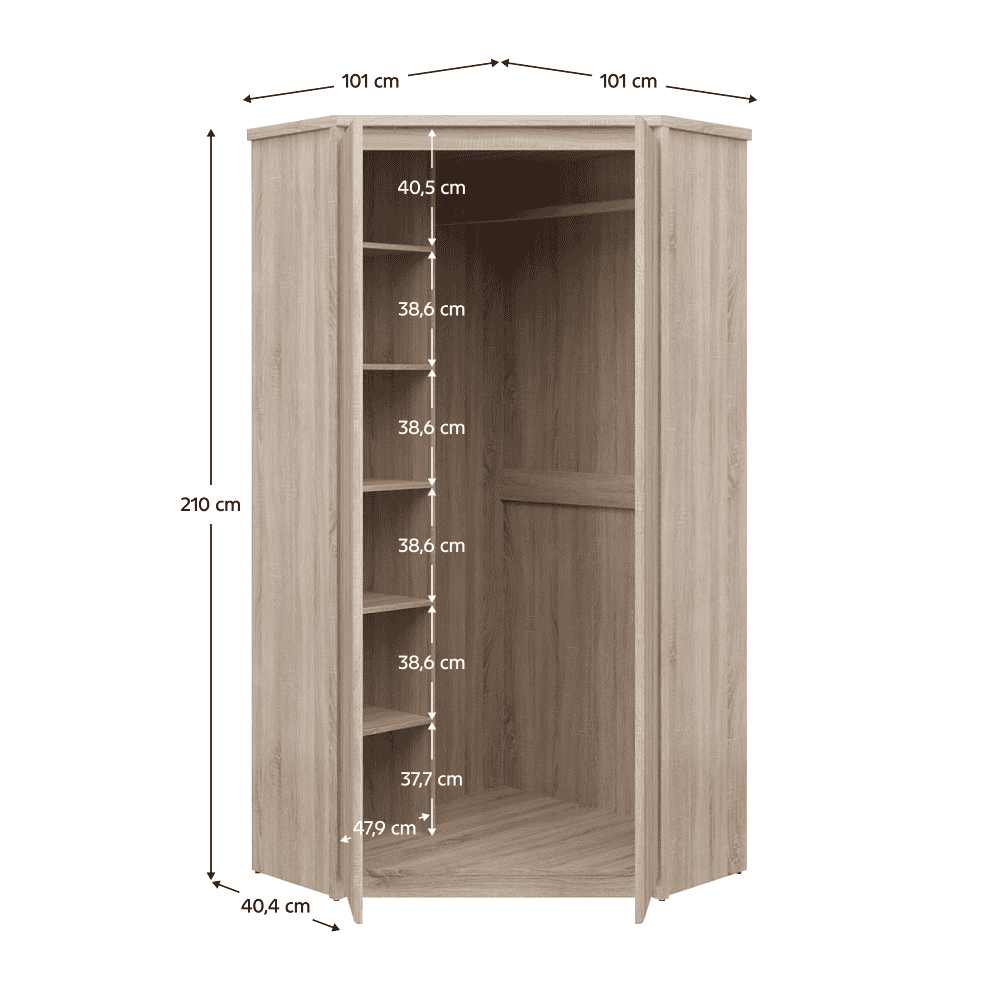 Material: DTD melaminat Culoare: stejar sonoma Dimensiuni (Lxlxh): 101x101x210 cm Grosime material: 3,2 cm Grosimea materialului celelalte părţi: 1,6 cm Spaţiu de depozitare Uşă dublă Partea poliţei Portanţa poliţei: 5 kg Bară pentru umeraşe Portanţa barei pentru umeraşe: 15 kg De colţ Livrat dezasamblat