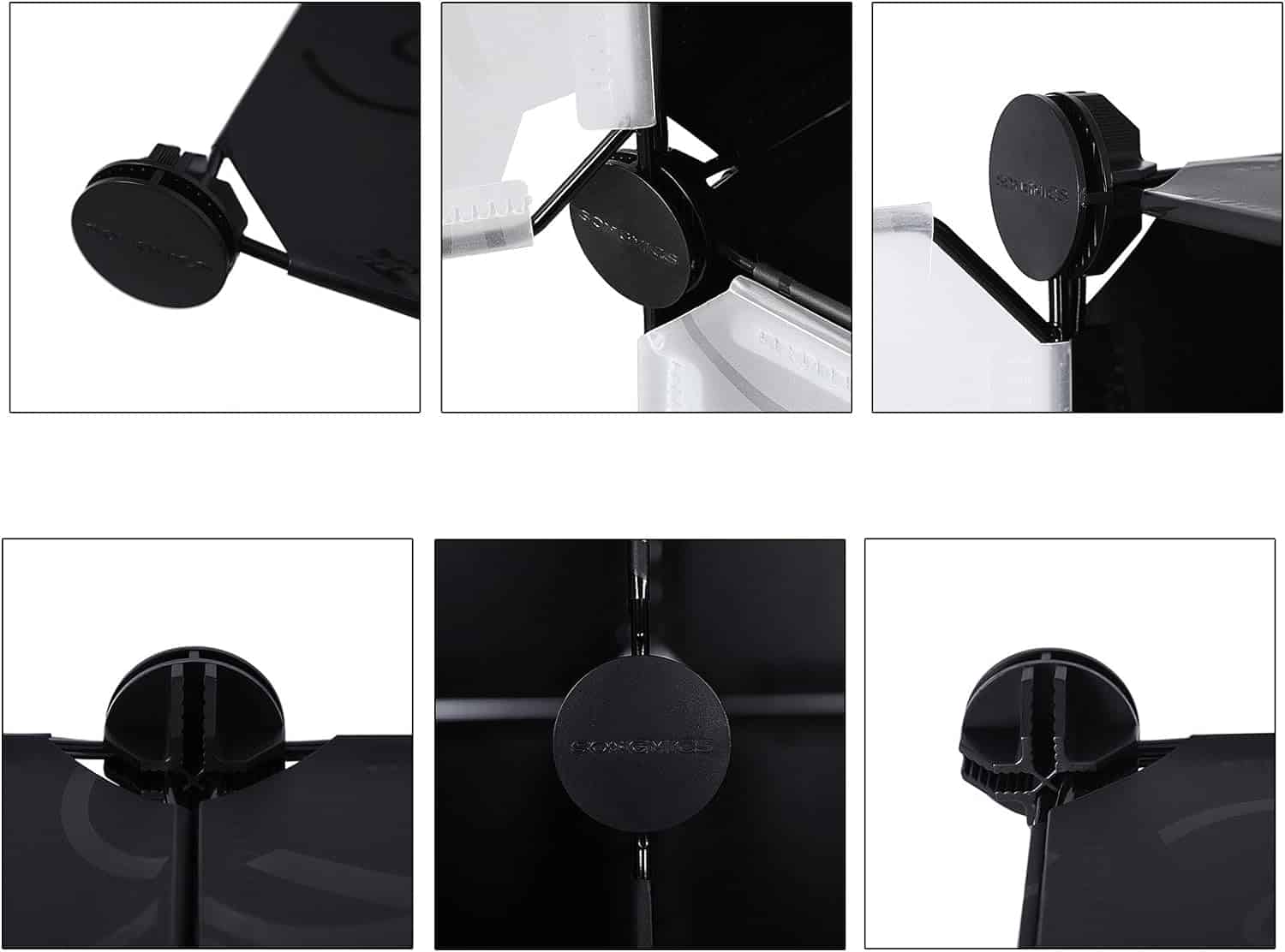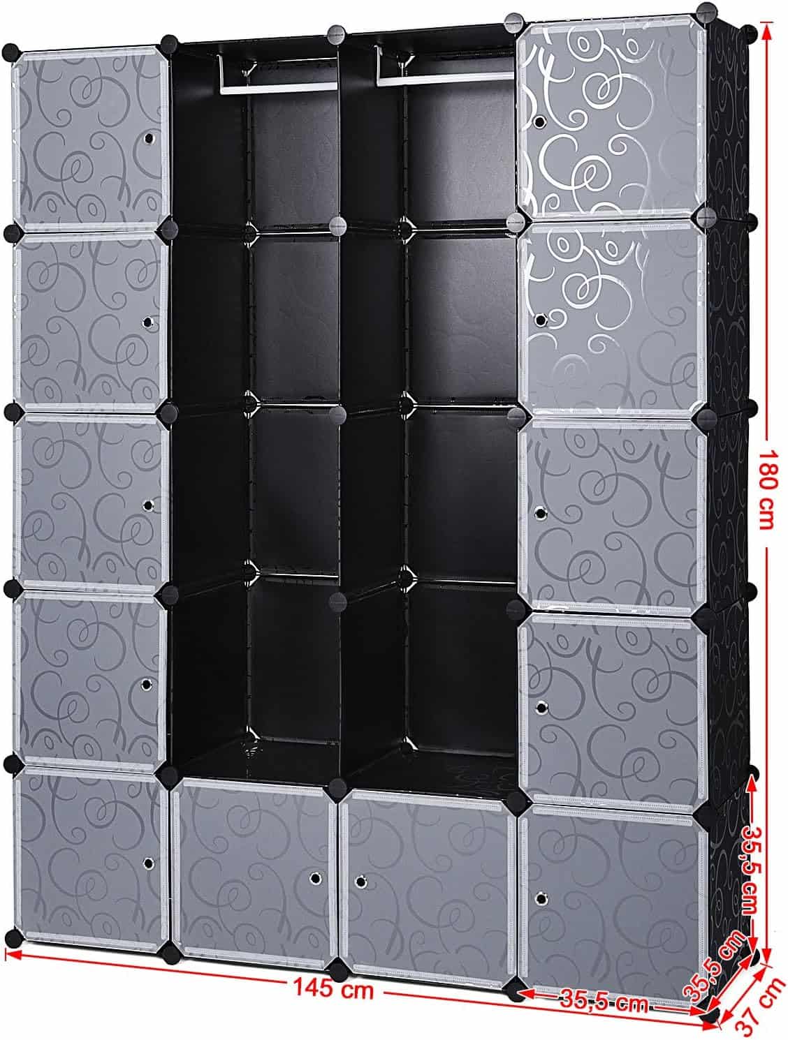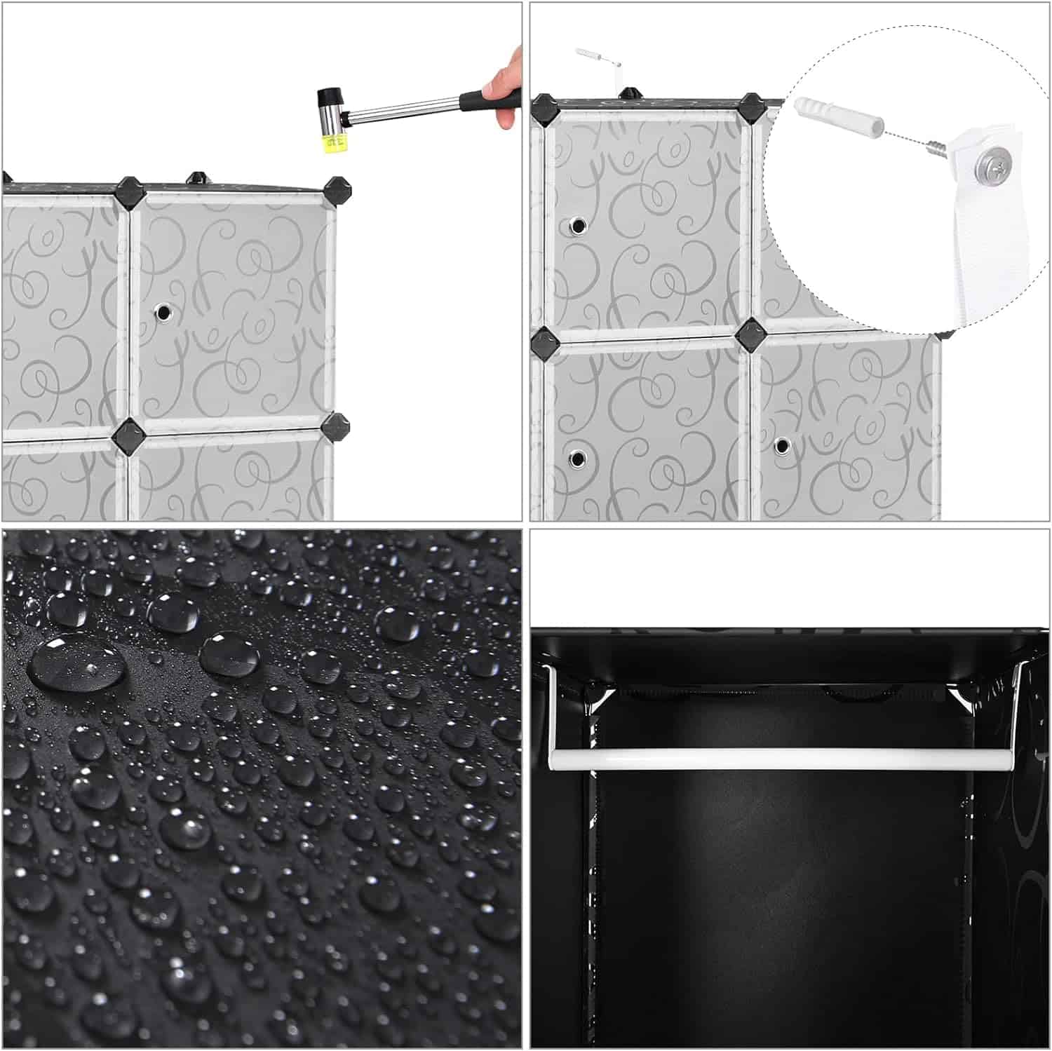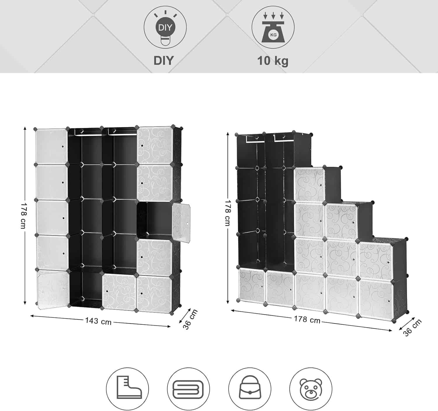 Cu suruburile si diblurile incluse, dulapul pentru rafturi poate fi ancorat de perete pentru un suport sigurUsor si flexibil pentru asamblare/dezasamblare – Pregatit cu doar cateva tipuri de piese individuale intr-o structura simpla, practic la schimbare, este inclus un ciocan de cauciuc de inalta calitate pentru atasarea tuturor pieselorIsi indeplineste perfect scopul – dulapul de depozitare poate fi folosit pentru orice zona de locuit, de exemplu pe hol, sufragerie, chiar si birou, este ideal pentru depozitarea/organizarea hainelor, pantofilor, ustensilelor de baie, jucariilor de plus etc.Usor de curatat si intretinut – Panourile din PP sunt rezistente la apa, la umezeala, la mucegai si la praf.
