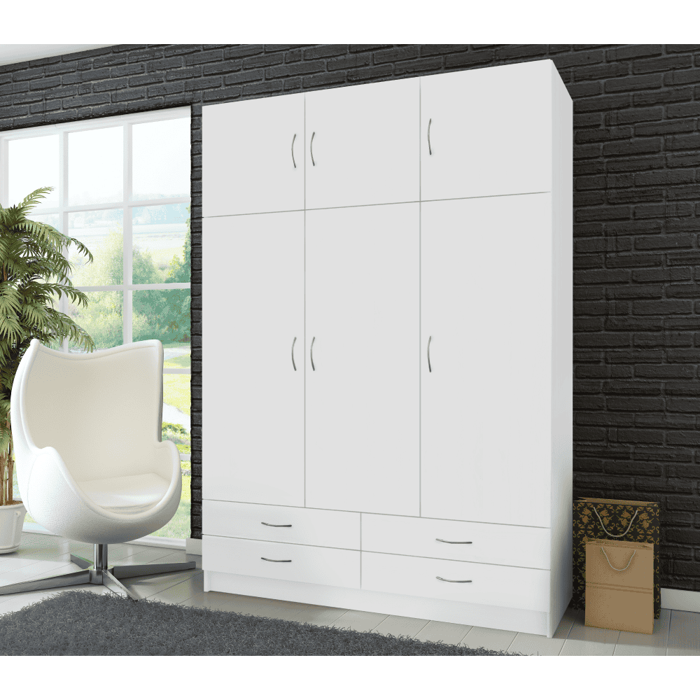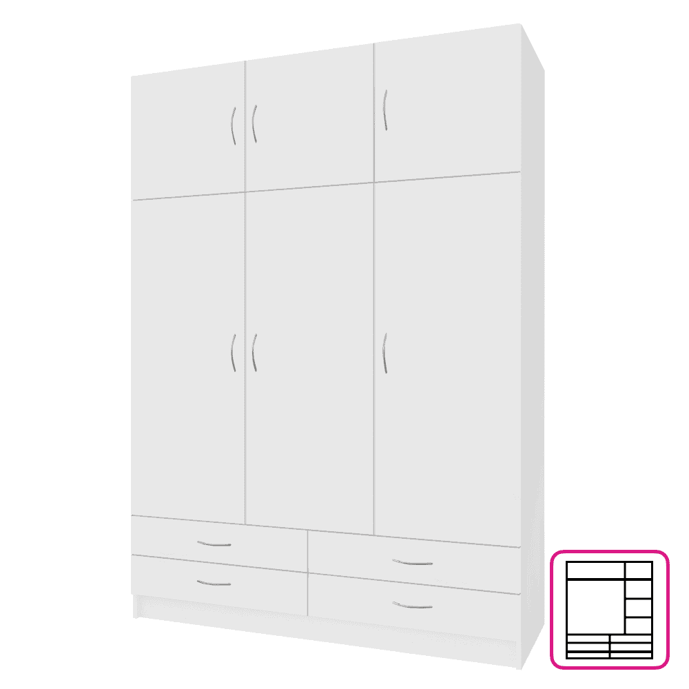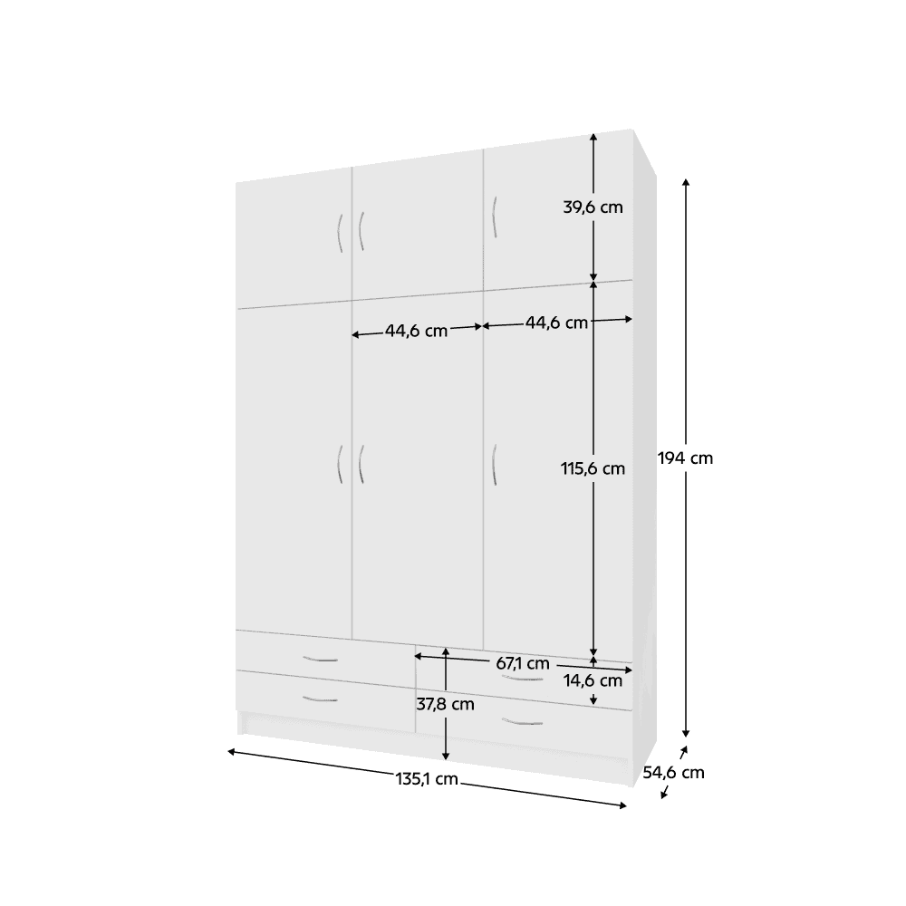 Material: DTD laminat Culoare: albă Dimensiuni (Lxlxh): 135,1×54,6×194 cm Dimensiuni sertar (Lxh): 67,1×14,6 cm Cu trei uşi Patru sertare Portanţă sertar: 3 kg Cu extensii Cu poliţe Portanţă poliţă: 5 kg Cu umeraşe Portanţă bară de umeraşe: 10 kg Mânere metalice Livrat dezasamblat