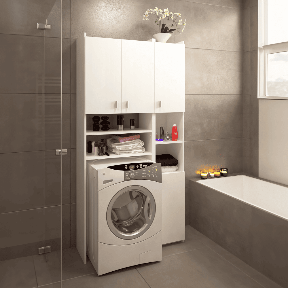 Material: DTD laminat Culoare: albă Dimensiuni (Lxlxh): 96x32x190 cm Dimensiune pentru maşina de spălat (Lxlxh): 60,8x32x85 cm Grosime material: 1,6 cm Spaţiu de depozitare deschis Cu poliţă Portanţă pe poliţă: 5 kg Cu mânere din plastic Dulapul este construit pe glisiere Dulap cu patru uşi Uşi universale pe raft Crearea practică a spaţiului de depozitare Produs slovac de calitate Aduce organizare şi aranjament în baie Recomandat pentru a fi ataşat la perete Livrat dezasamblat