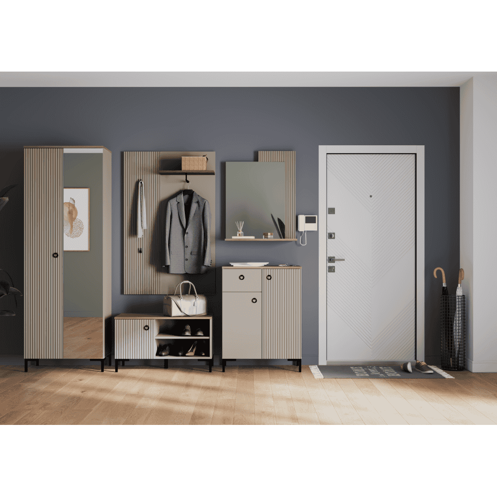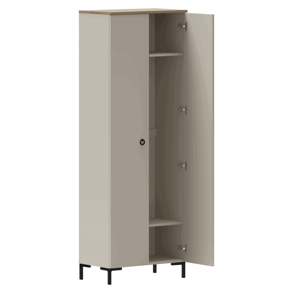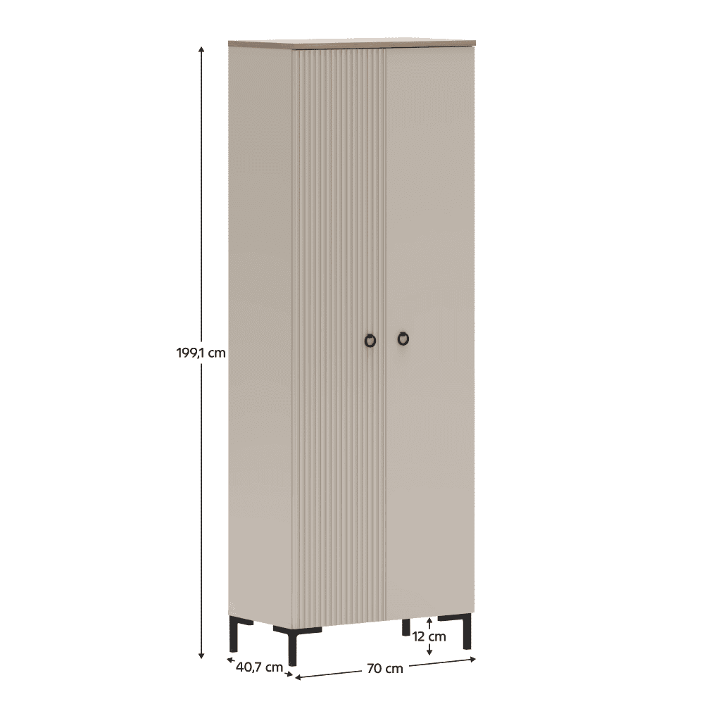 Material: MDF laminat DTD/înfoliat Culoare: gri-maroniu Taupe/stejar silverjack Dimensiuni (lxAxh): 70×40,7×199,1 cm Grosimea materialului DTD: 1,6-1,8 cm Grosimea materialului MDF: 1,9 cm Cu două uşi Cu poliţe Bară de umeraşe extensibilă Portanţă poliţă: 5 kg Uşă universală Cu mânere Material mâner: metal Culoare mâner: negru mat Pe picioare Înălţimea piciorului: 12 cm Material picior: plastic Culoare picior: negru mat Uşi decorative frezate Design modern Recomandăm fixarea pe perete Livrat dezasamblat
