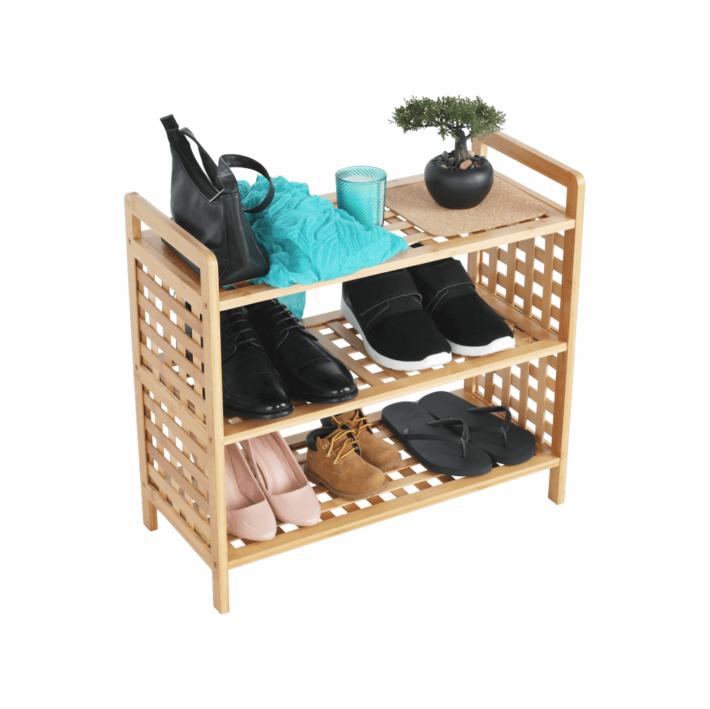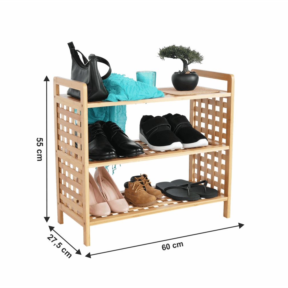 Dulap pt. Încălţăminte 3-poliţe , material: bambus lăcuit, culoare: bambus natural. Dimensiuni (LxGxÎ): 60×27,5×35 cm.