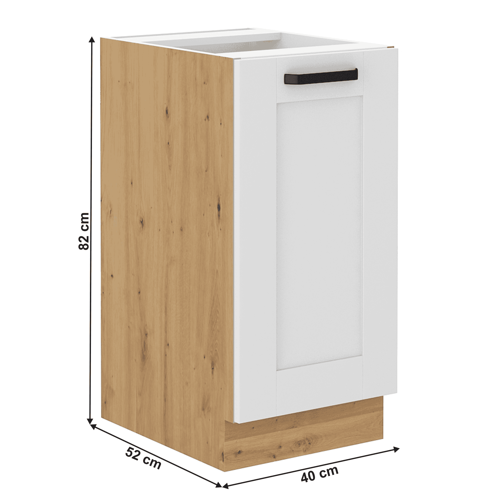 Dulap inferior LULA 40 D 1F BB Material: laminat DTD/MDF înfoliat Culoare: albă/stejar artizan Dimensiuni (LxAxÎ): 40x52x82 cm Grosime material: 1,6 cm Cu uşă, Cu raft, Grosime uşă: 2 cm Cu mâner metalic, Culoarea mânerului: neagră, Fără blat, Design dinamic modern, Livrat dezasamblat, Opţiunea de a cumpăra o chiuvetă universală LAY ON, Dulapurile inferioare sunt furnizate împreună cu şina inferioară, Fără blat de lucru. Opţiunea de a achiziţiona blat de lucru din stejar artizan stejar artizan la preţul de 399 lei/m sau marmură roma la preţul de 379 lei/m. Opţiunea de a achiziţiona o chiuvetă universală LAY ON.