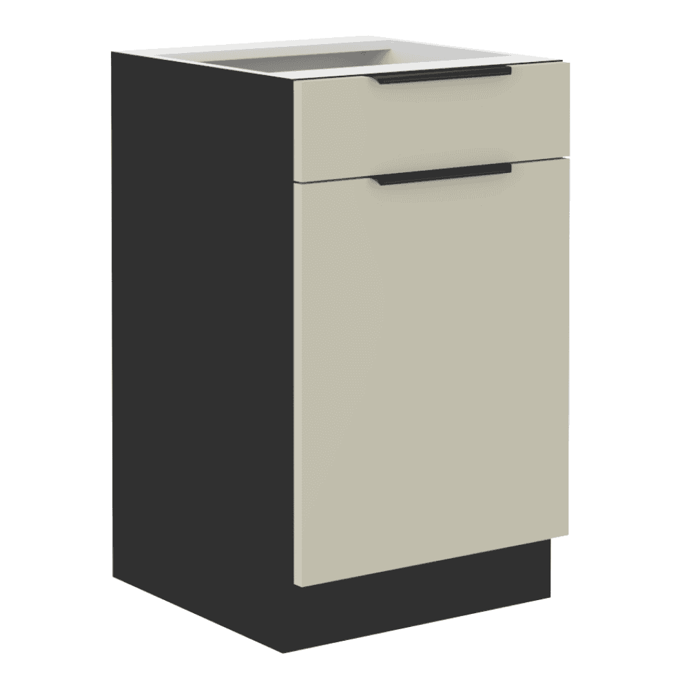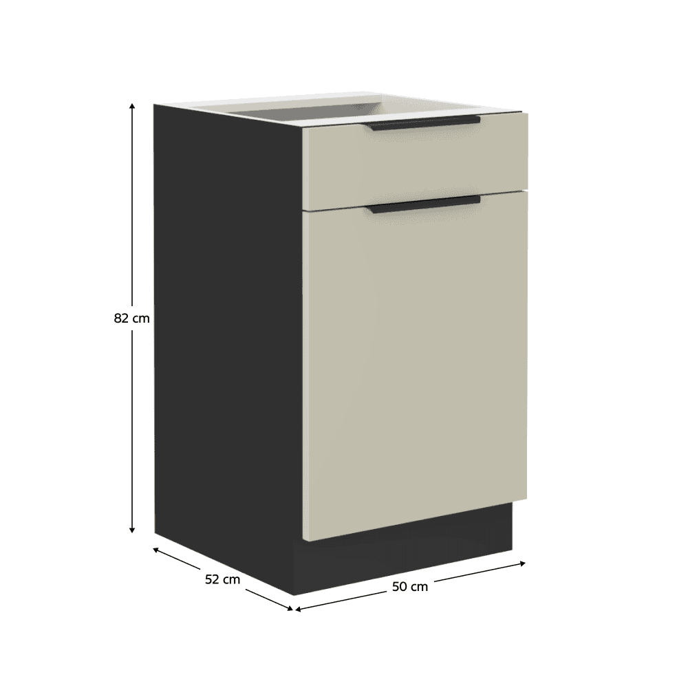 Material: DTD laminat Culoarea uşii: caşmir Culoarea dulapului: negru mat Dimensiuni (Lxlxh): 50x52x82 cm Grosime material: 1,6 cm 1 sertar, Cu uşă, Cu poliţă, Cu mâner, Culoarea mânerului: aluminiu, Cu şină inferioară/soclu, Fără blat de lucru, Design modern, Oprire silenţioasă a sertarului, Oprire silenţioasă a uşii Sertar tip PREMIUM BOX, cu laterale din oţel, Cu posibilitatea de a cumpăra chiuveta universală LAY ON, Se livrează dezasamblat, Dulapurile inferioare sunt furnizate împreună cu şina inferioară, fără blat de lucru. Opţiunea de a achiziţiona blat de lucru din marmură roma la preţul de 379 Lei/m. Opţiunea de a achiziţiona o chiuvetă universală LAY ON.