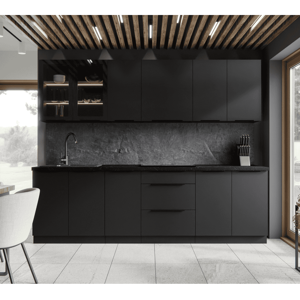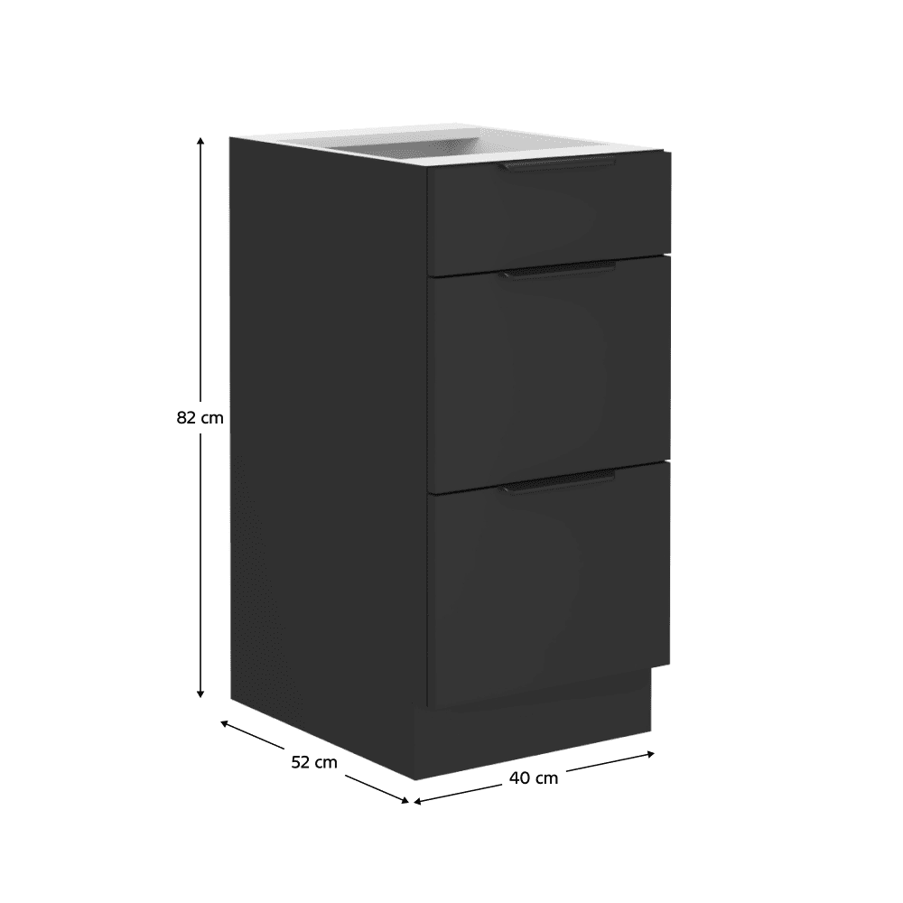 Material: DTD laminat Culoarea uşii: negru Culoarea corpului: negru mat Dimensiuni (Lxlxh): 40x52x82 cm Grosime material: 1,6 cm Cu sertare Cu mâner Culoarea mânerului: aluminiu Fără blat Cu şină inferioară/plintă Sistem de oprire silenţioasă a sertarului Sertar PREMIUM BOX cu lateralele din oţel Design modern Se poate fi achiziţiona chiuveta universală LAY ON Se livrează dezasamblate Dulapurile modulare inferioare sunt livrate cu şină inferioară (plintă), fără blat. Blatul de lucru cu o grosime de 3,8 cm poate fi comandat separat în finisaj de tip stejar artisan la preţul de 399,- pe m.