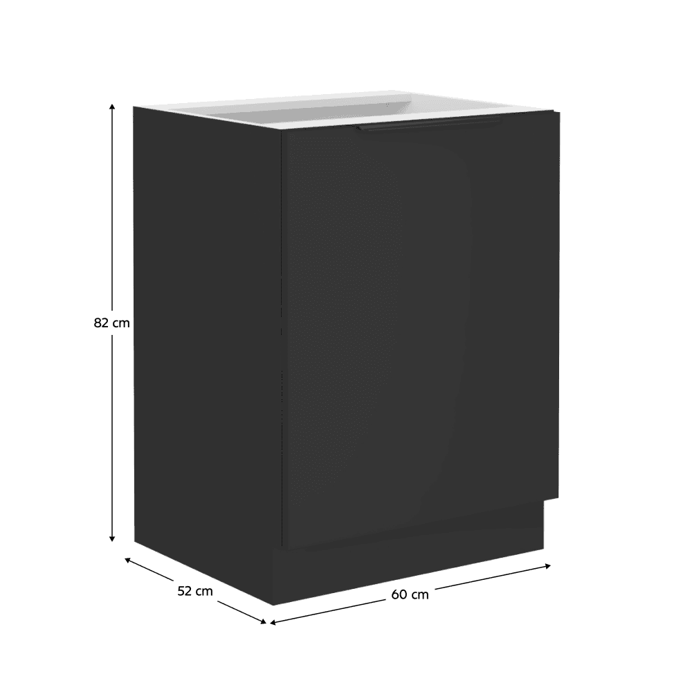 Material: DTD laminat Culoarea uşii: negru Culoarea corpului: negru mat Dimensiuni (Lxlxh): 60x52x82 cm Grosime material: 1,6 cm Cu uşi Cu poliţe Cu mâner Culoare mâner: aluminiu Fără blat Cu şină inferioară/plintă Sistem de închidere silenţioasă a uşilor Design modern Se poate achiziţiona chiuveta universală LAY ON Se livrează dezasamblate Dulapurile din modularul inferior sunt livrate cu şină inferioară (plintă), fără blat. Blatul de lucru cu o grosime de 3,8 cm poate fi comandat separat în finisaj de tip stejar artisan la preţul de 399,- pe m.