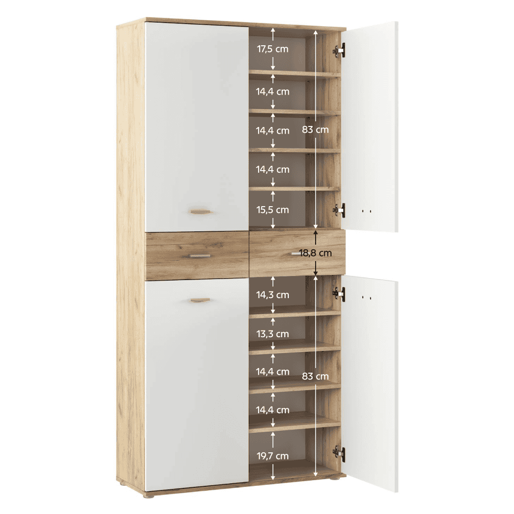 Material: DTD laminat Culoare: albă/stejar artisan Dimensiuni (lxAxh): 90x35x190.8 Grosimea materialului: 1,6 cm Cu poliţe Portanţă poliţă: 5 kg 2 sertare Dimensiuni sertar (lxh): 44,6×18,8 cm Portanţă sertar: 5 kg Cu ??două uşi Cu mânere Materialul mânerelor: PVC Culoare mânere: argintiu Pe glisoare Practic Multifuncţional Produs slovac de calitate Recomandăm fixarea pe perete Se livrează dezasamblat