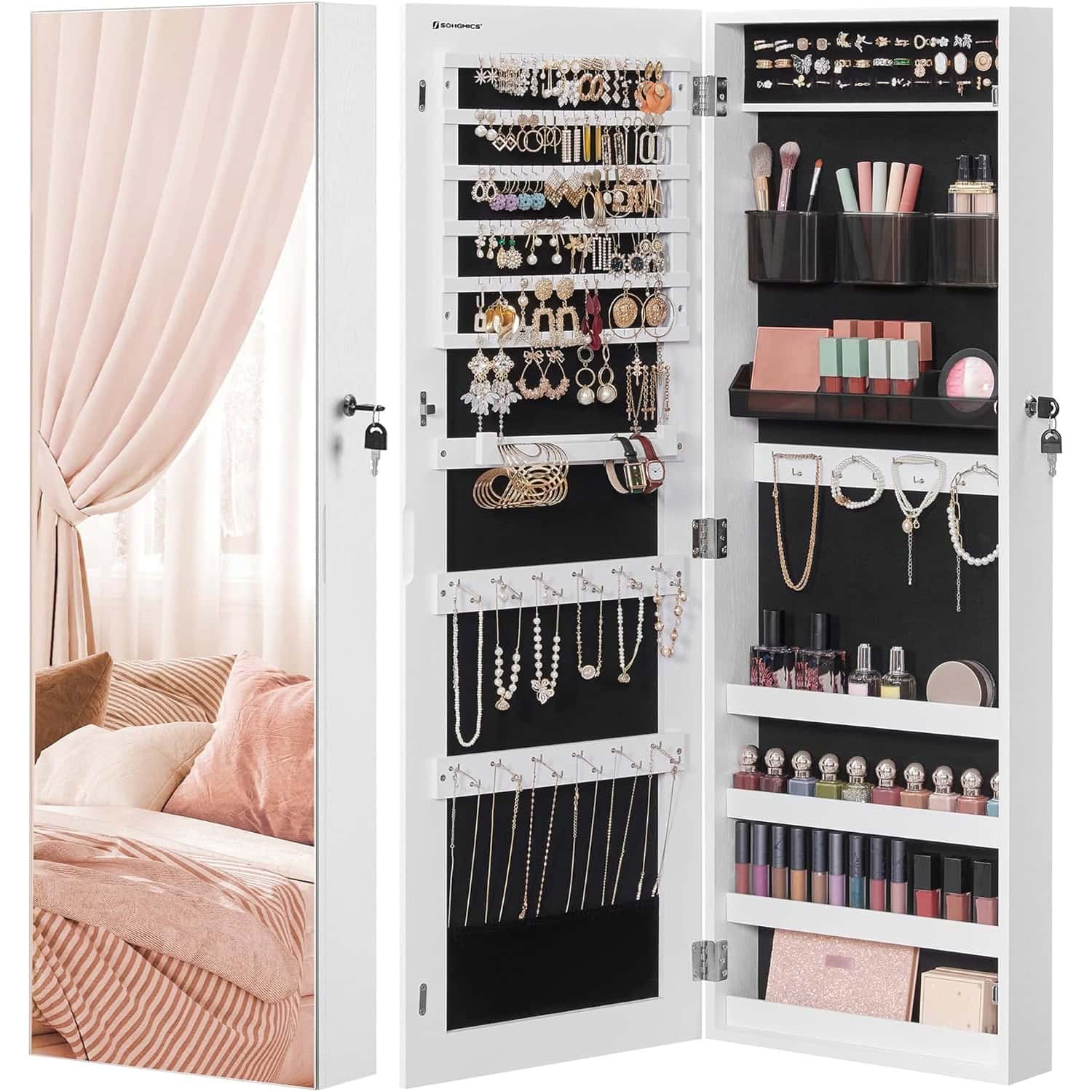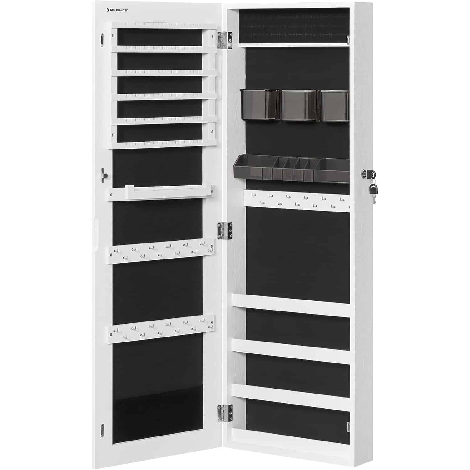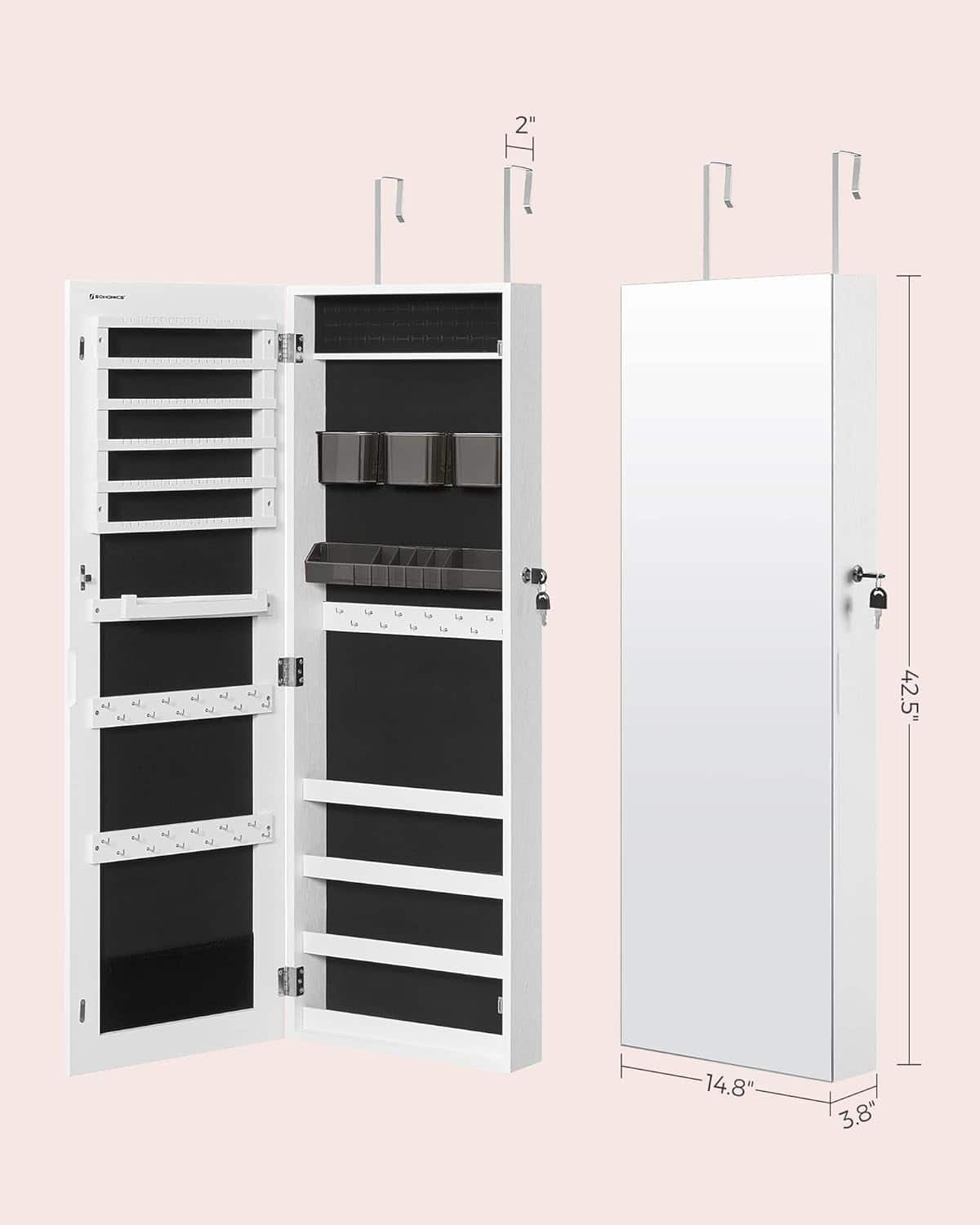Dulap pentru bijuterii, cu oglinda design fara rama, MDF, montare pe perete sau usa, 37x10x108 cm, alb Mob360