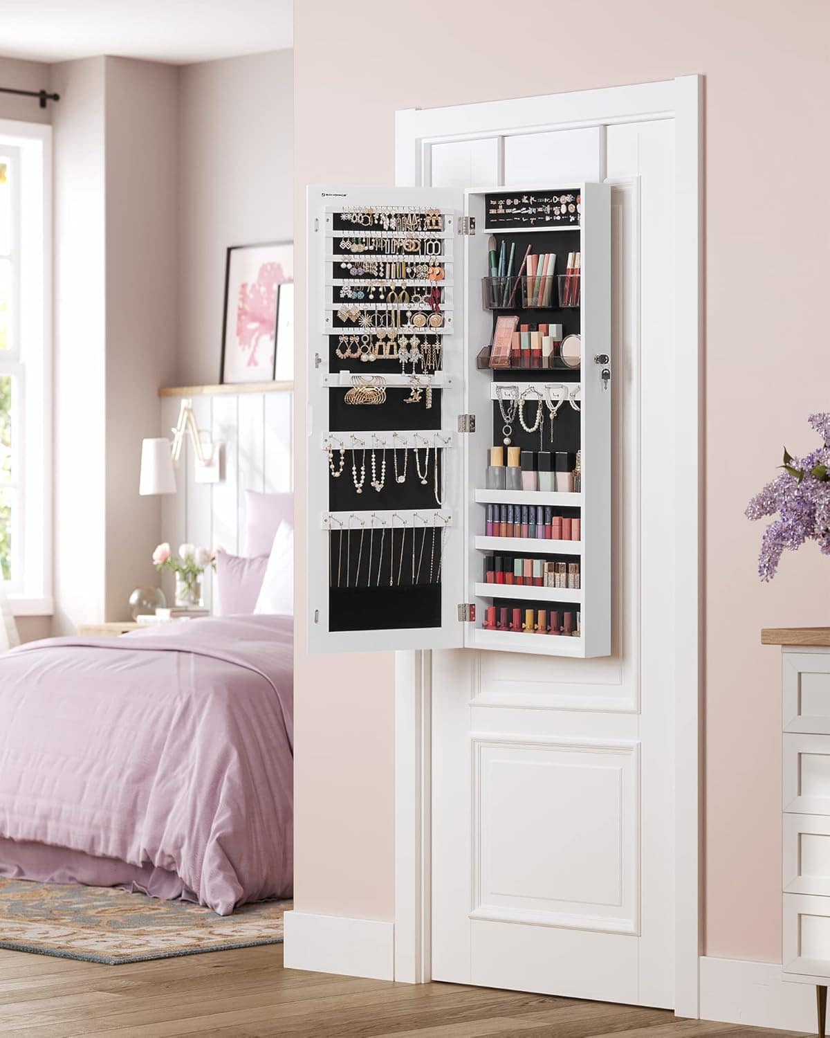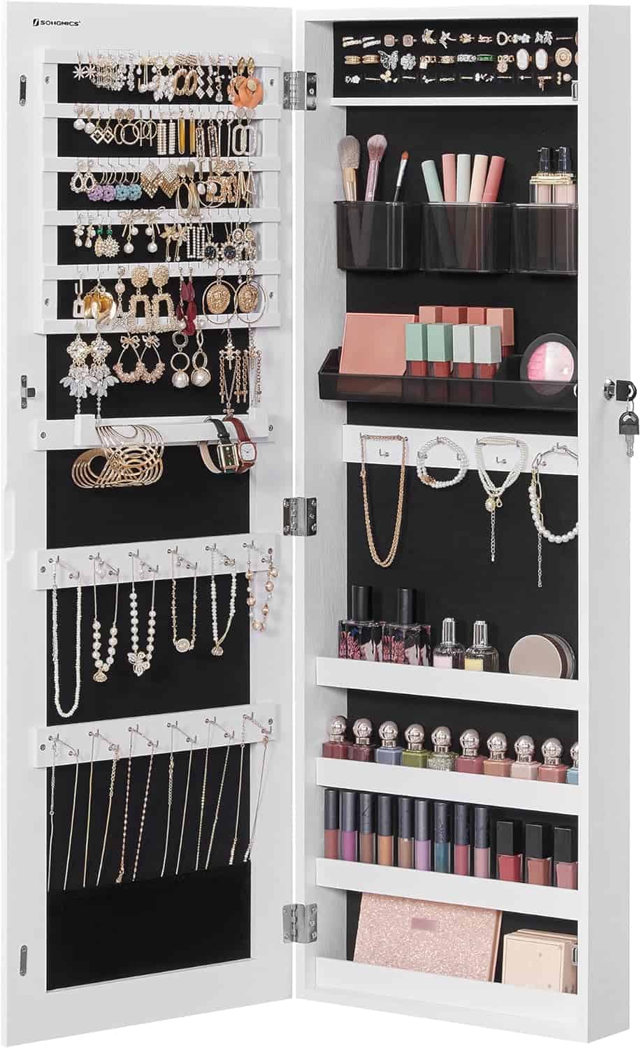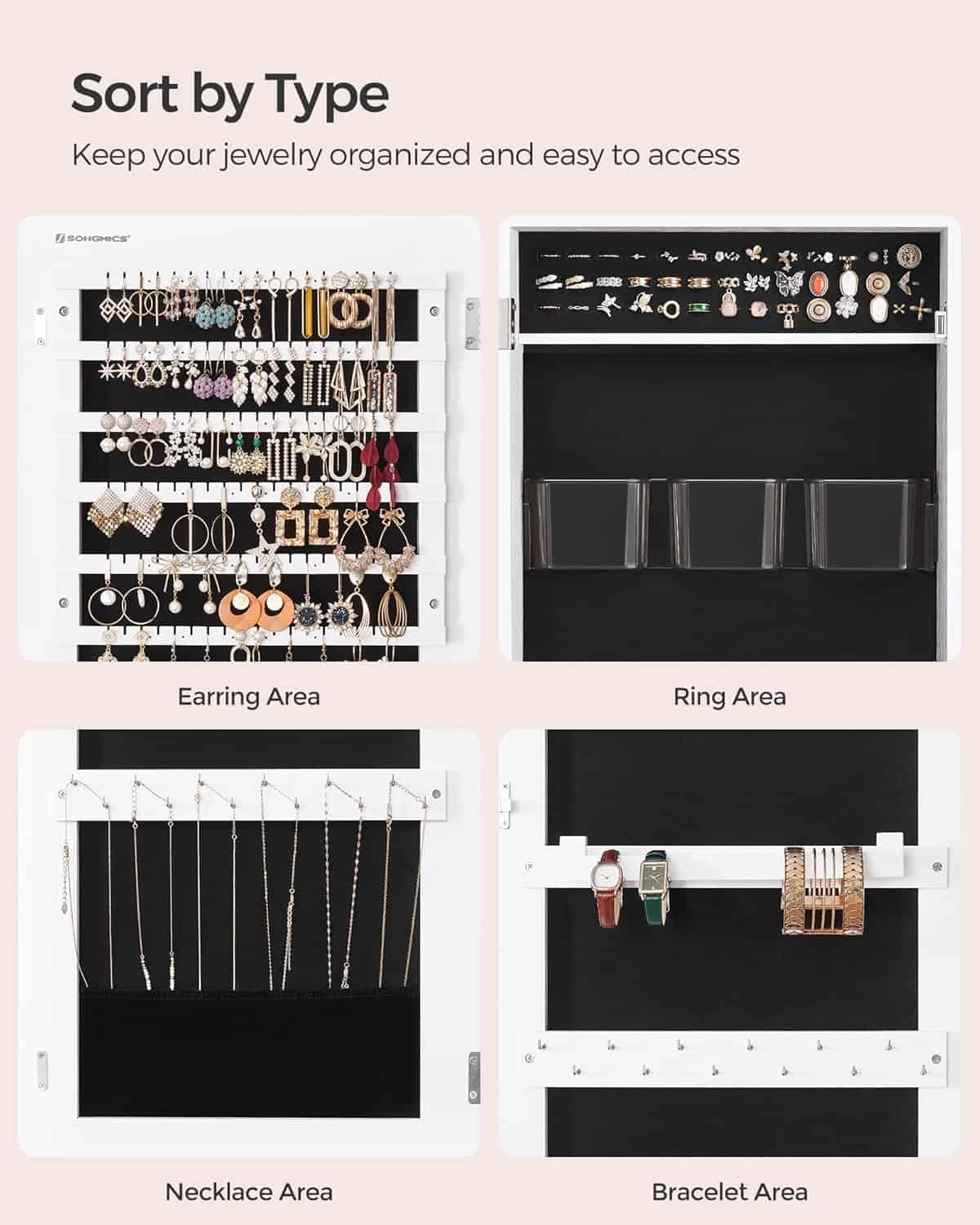 Dulap pentru bijuterii, cu oglinda design fara rama, MDF, montare pe perete sau usa, 37x10x108 cm, alb Mob360