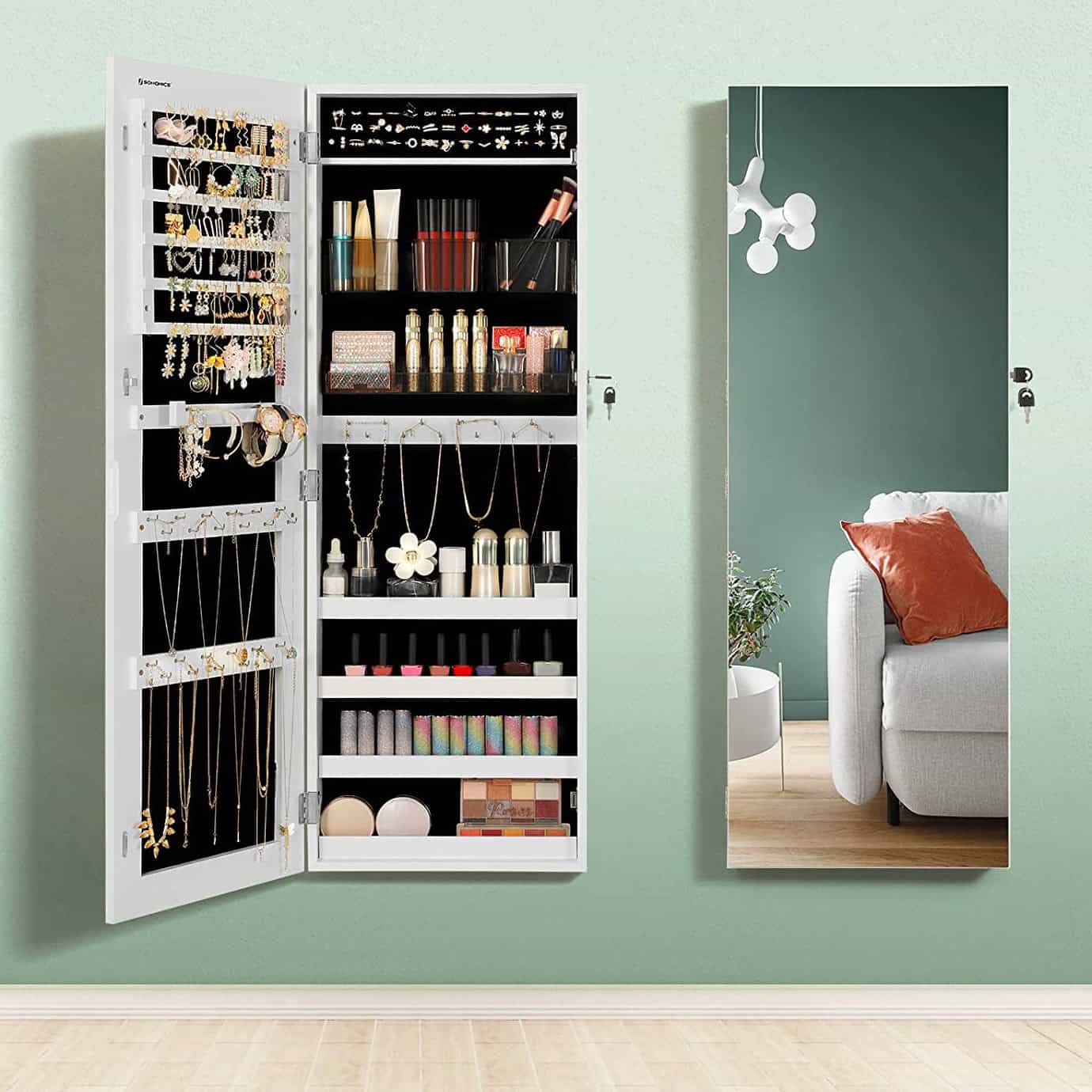 - Dulap elegant pentru bijuterii si cosmetice, conceput pentru organizare completa intr-un singur loc. Interiorul bine compartimentat permite depozitarea accesoriilor si produselor de machiaj fara aglomerare, iar oglinda pe toata inaltimea adauga functionalitate si stil. Designul suspendat economiseste spatiu si se integreaza usor in orice dormitor sau dressing. Caracteristici principale: