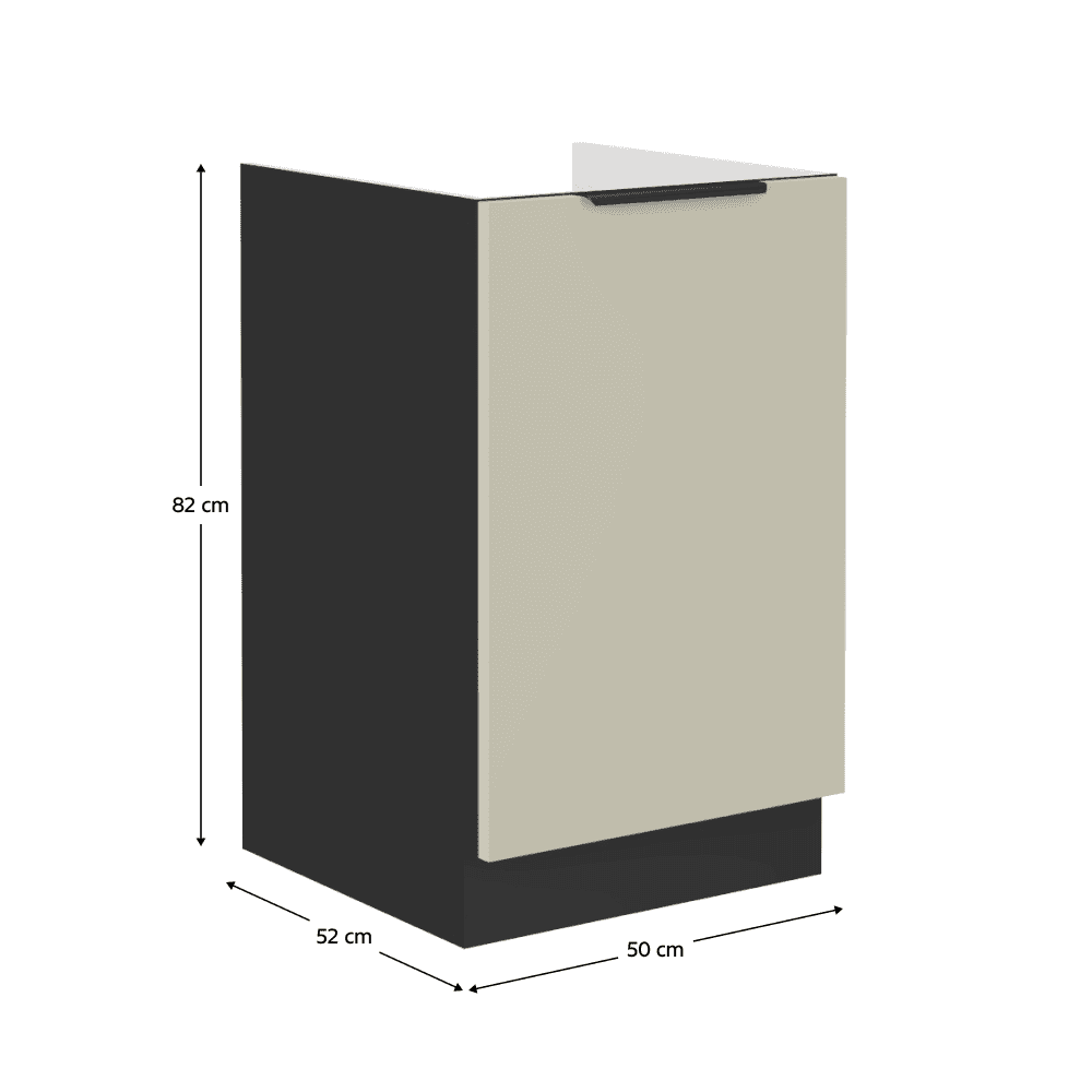 Material: DTD laminat Culoarea uşii: caşmir Culoarea dulapului: negru mat Dimensiuni (Lxlxh): 50x52x82 cm Grosime material: 1,6 cm Cu două uşi, Cu mâner, Culoarea mânerului: aluminiu, Design modern, Cu şină inferioară/soclu, Fără blat de lucru, Furnizat fără chiuvetă, Cu sistem de închidere silenţioasă a uşii Cu posibilitatea de a cumpăra chiuveta universală LAY ON, Se livrează dezasamblat, Dulapurile inferioare sunt furnizate împreună cu şina inferioară, fără blat de lucru. Opţiunea de a achiziţiona blat de lucru din marmură roma la preţul de 379 Lei/m. Opţiunea de a achiziţiona o chiuvetă universală LAY ON.