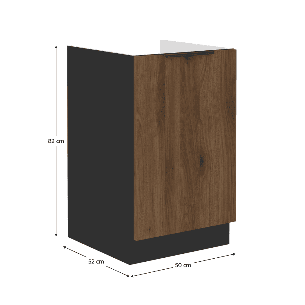 Material: DTD laminat Culoarea uşii: nuc okapi Culoarea dulapului: negru mat Dimensiuni (Lxlxh): 50x52x82 cm Grosime material: 1,6 cm Cu o uşă Cu mâner Culoarea mânerului: aluminiu Cu şină inferioară/plintă, Fără blat de lucru, Design modern un Sistem de închidere silenţioasă a uşilor Opţiunea de a achiziţiona o chiuvetă universală LAY ON Se livrează dezasamblat Dulapurile inferioare sunt furnizate împreună cu şina inferioară, fără blat de lucru. Opţiunea de a achiziţiona blat de lucru din marmură roma la preţul de 379,-/m. Opţiunea de a achiziţiona o chiuvetă universală LAY ON.