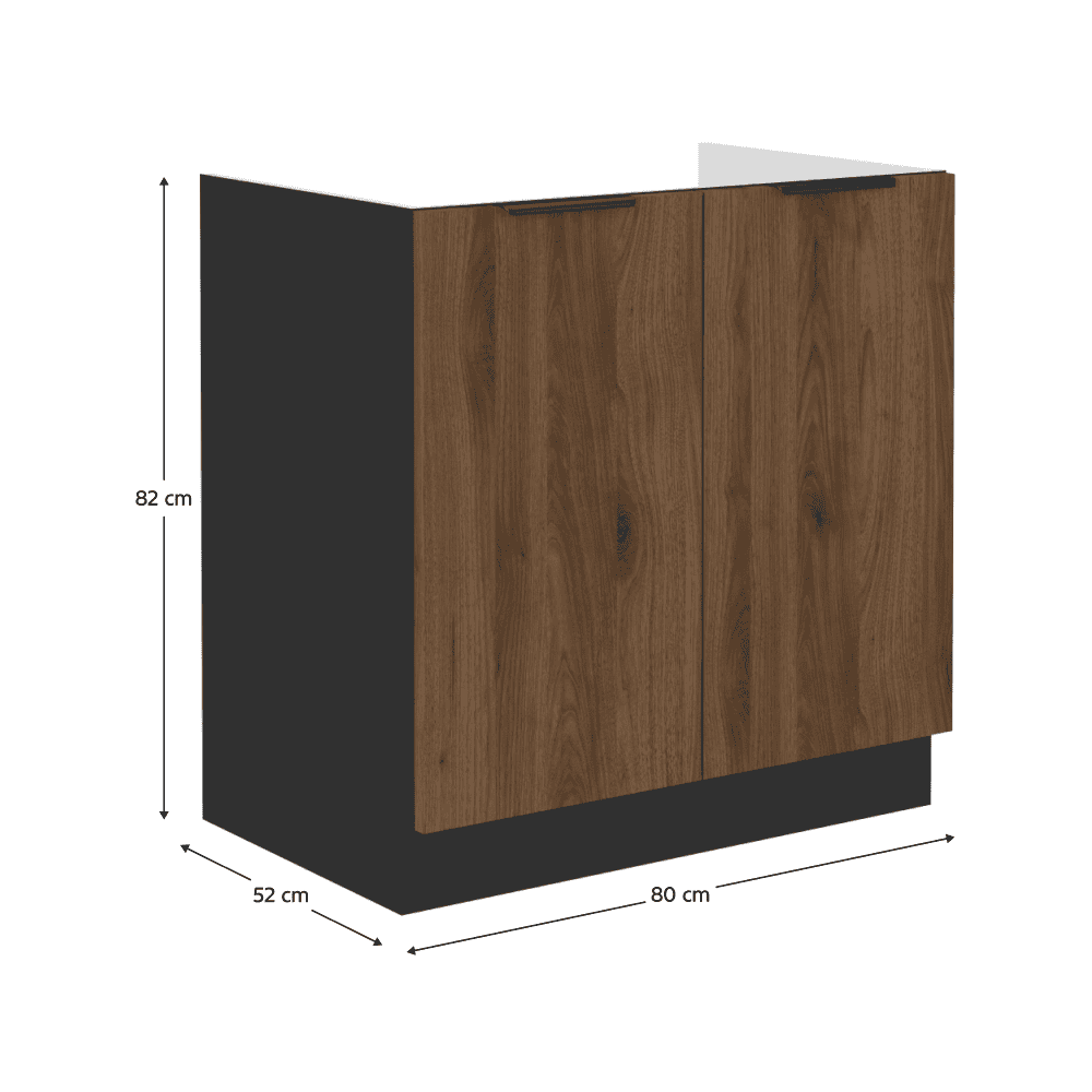 Material: DTD laminat Culoarea uşii: nuc okapi Culoarea dulapului: negru mat Dimensiuni (Lxlxh): 80x52x82 cm Grosime material: 1,6 cm Chiuvetă dublă cu mâner Culoarea mânerului: aluminiu Fără blat Cu şină inferioară/plintă Sistem de închidere silenţioasă a uşii Poate fi achiziţionată suplimentar chiuveta universală LAY ON Design modern Se livrează dezasamblate Dulapurile inferioare sunt livrate cu şină inferioară inclusă, fără blat. Opţiunea de a achiziţiona blat de lucru din marmură roma la preţul de 379,-/m. Opţiunea de a achiziţiona o chiuvetă universală LAY ON.