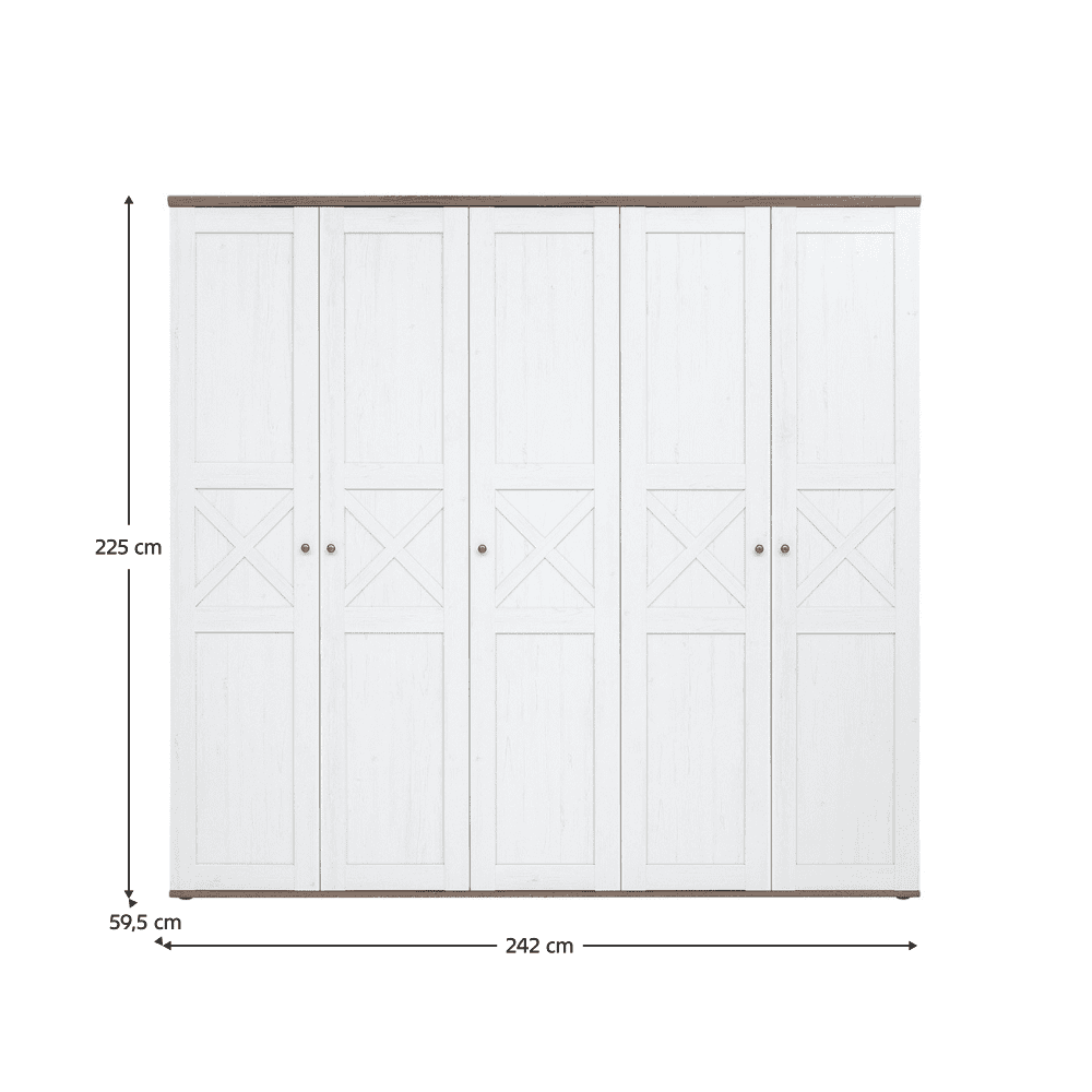 Material: laminat DTD Culoare: pin canyon/stejar sonoma trufel Dimensiuni (lxAxh): 242×59,5×225 cm Grosimea materialului: 1,6 cm Cu mânere Material mânere: metal Culoare mânere: argintiu vechi Cu cinci uşi Zonă de poliţe Portanţă poliţă: 5 kg Partea de umeraşe Portanţă bară pentru umeraşe: 17 kg Design modern Vă recomandăm să ataşaţi mobilierul de perete Livrat dezasamblat