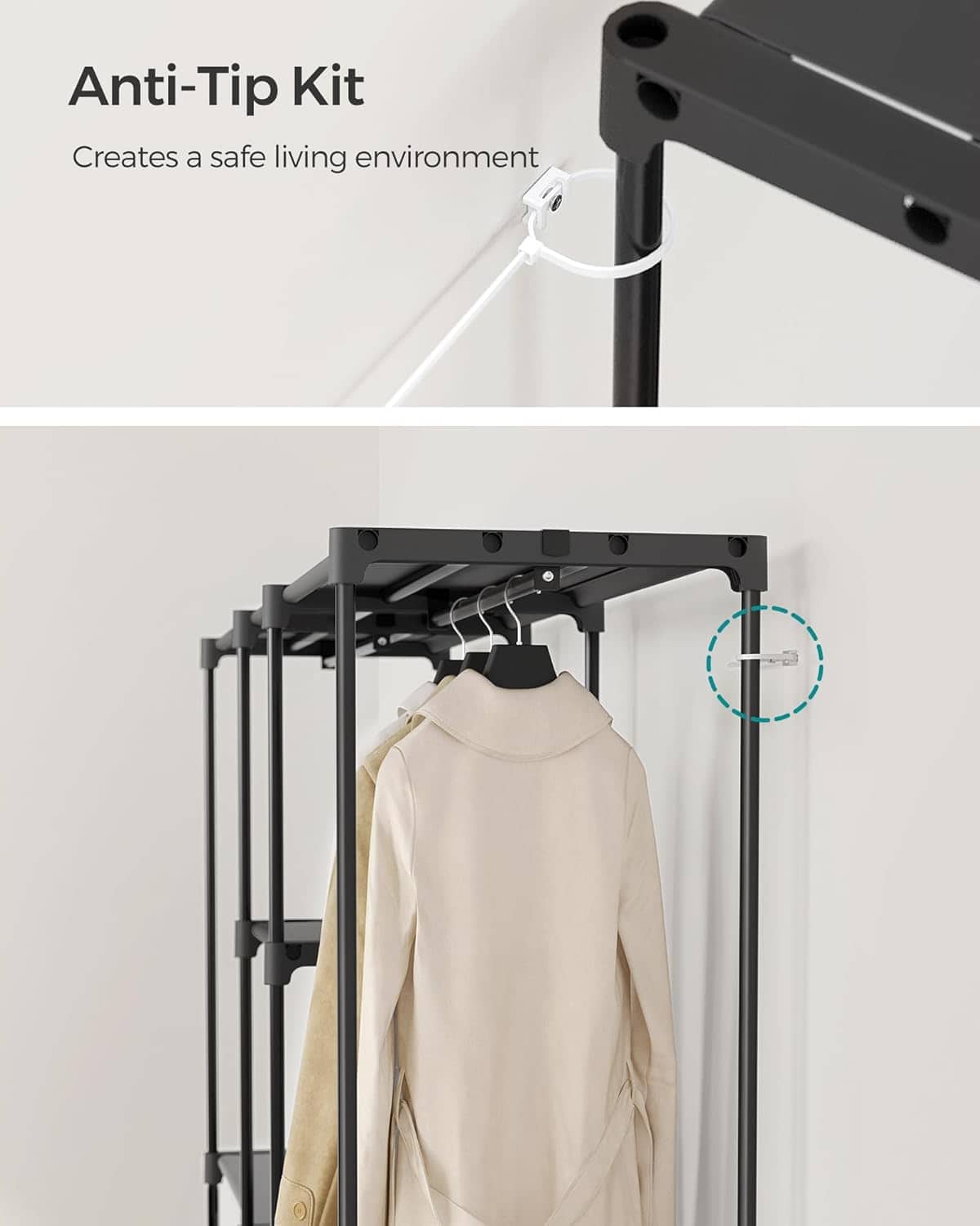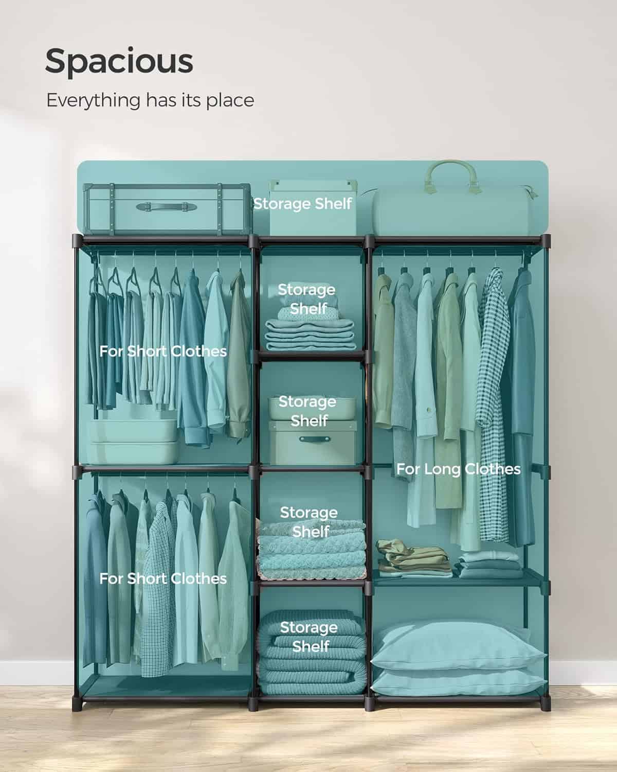 - Dulapul portabil pentru haine este proiectat pentru organizarea eficienta a articolelor vestimentare si a accesoriilor. Cu multiple rafturi textile si compartimente de suspendare pentru haine scurte si lungi, ofera spatiu generos intr-un format practic si usor de integrat in orice incapere. Caracteristici principale: