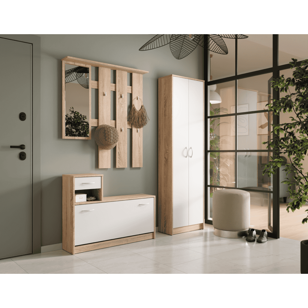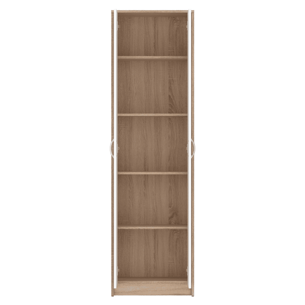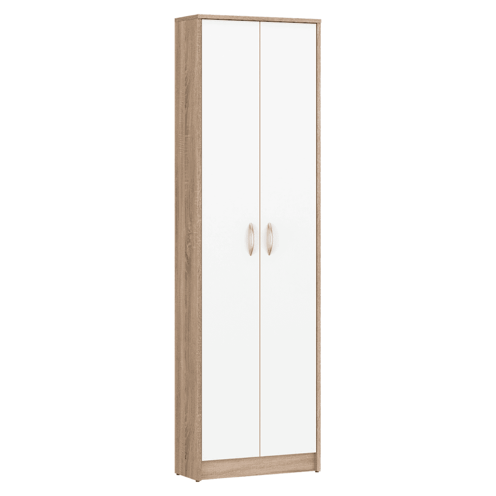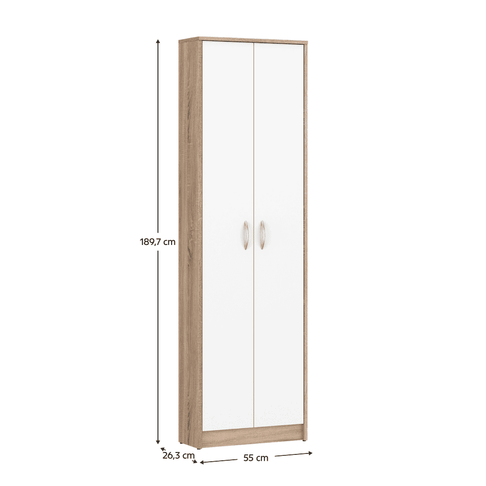 Material: DTD laminat Culoare: stejar sonoma/alb Dimensiuni (lxAxh): 55×26,3×189,7 cm Grosime material: 1,6 cm Cu două uşi Cu poliţe Portanţă poliţă: 5 kg Cu mânere Material mâner: plastic Culoare mâner: argintiu Design modern Se recomandă ataşarea pe perete Livrat dezasamblat