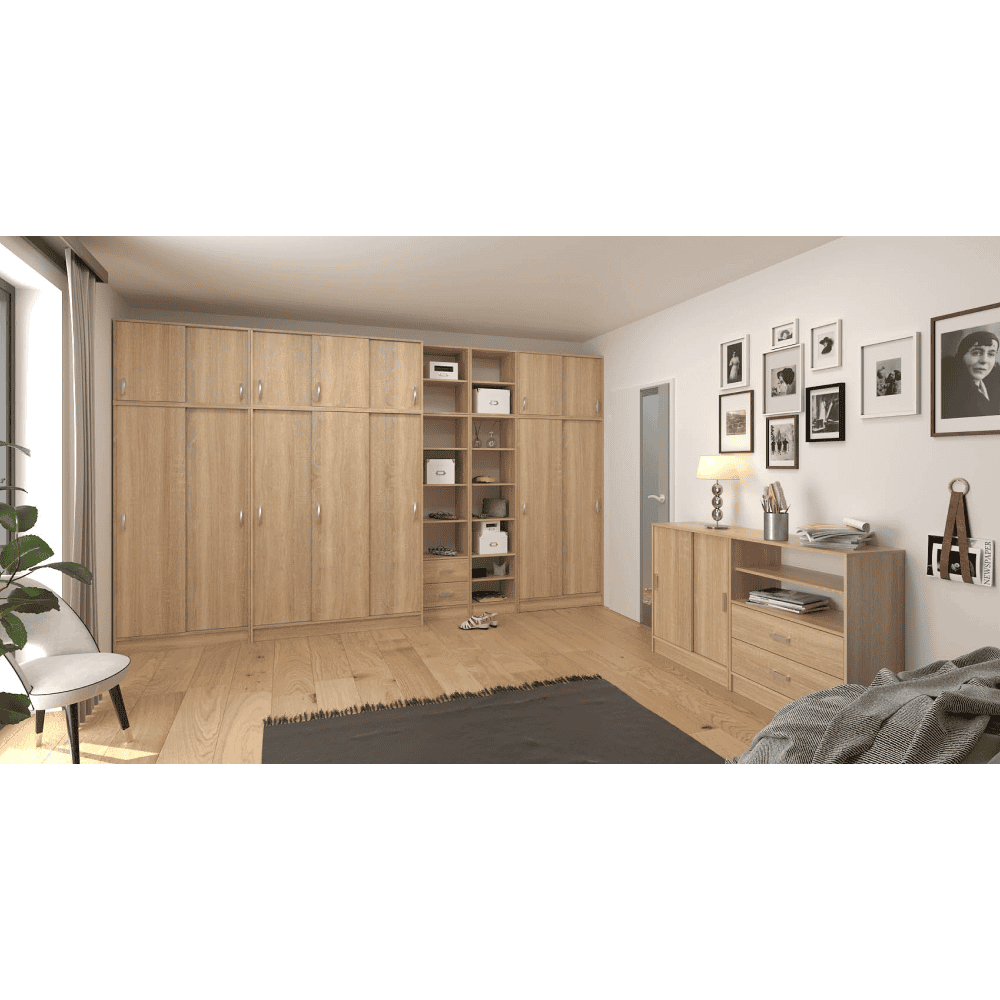 Mobilier de ansamblu universal potrivit pentru amenajarea dormitorului, camerei de copii şi camerelor de studenţi, material PAL melaminat, culoare: stejar sonoma sau fag. Toate componentele din ambele variante de culori sunt în stoc.