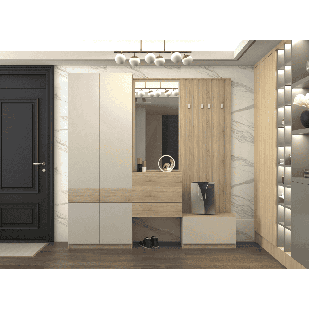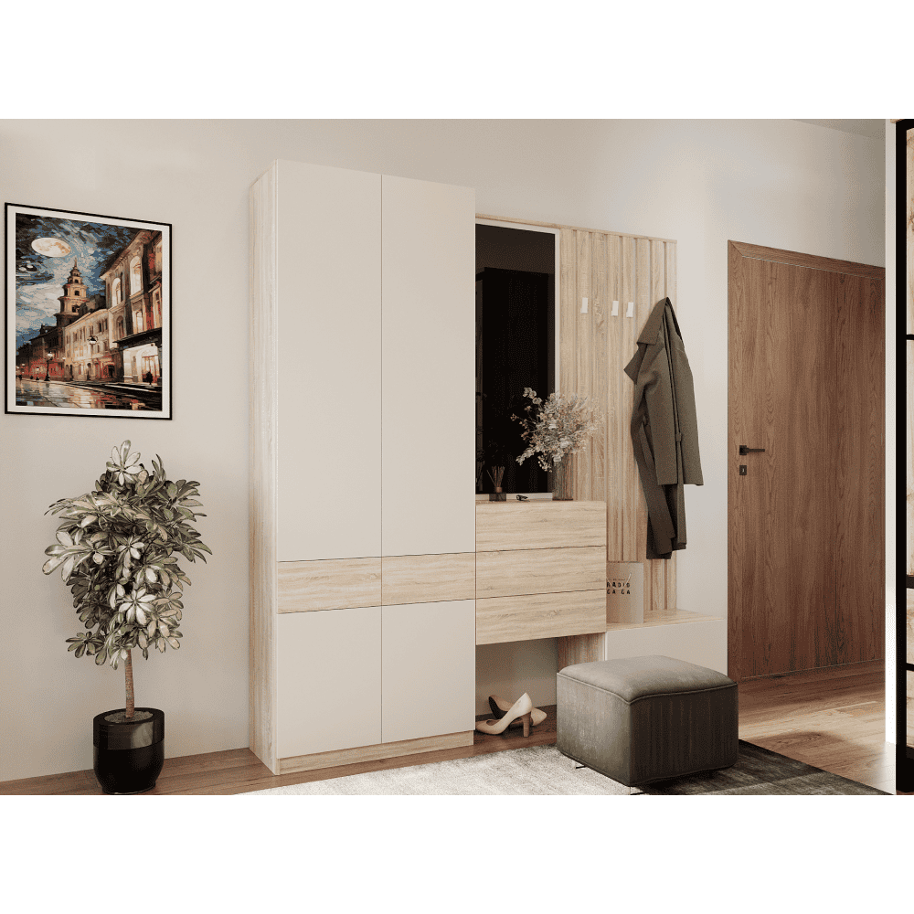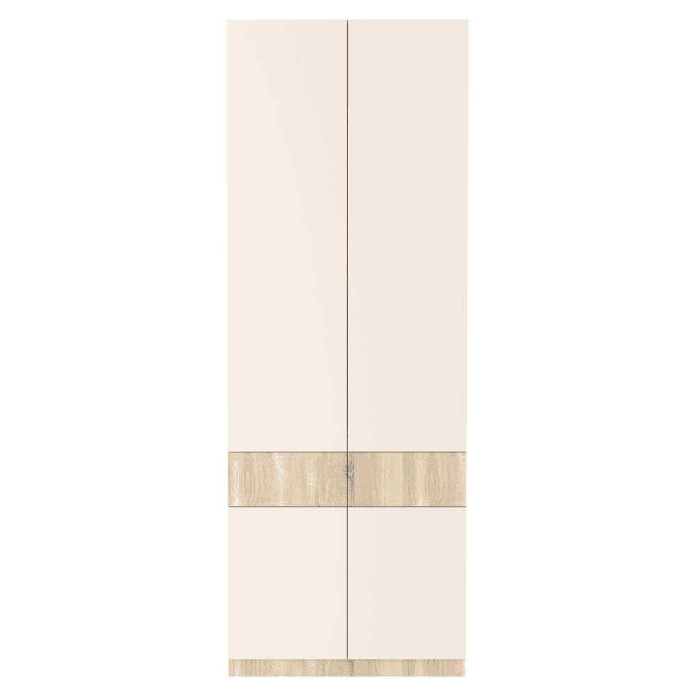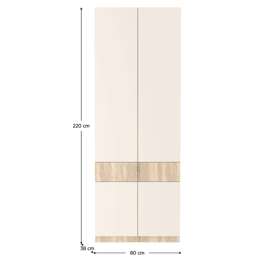 Material: DTD laminat Culoare: stejar sonoma/caşmir Dimensiuni (lxAxh): 80x38x220 cm Grosimea materialului DTD: 1,6-2,2 cm Cu patru uşi Bară pentru umeraşe Portanţa barei de umeraşe extensibile: 8 cm Cu poliţe Portanţa poliţei: 7 kg Două sertare Portanţă sertar: 3 kg Rulment cu bile extensibil complet Balamale Margine: hârtie impregnată cu polimeri termoreactivi DTD grosime spate/fundul sertarului: 0,3 cm Culoarea părţii din spate/fund sertar: stejar sonoma Fără mânere Sistem de deschidere tactilă PUSH UP Glisiere din plastic Design modern Recomandăm fixarea de perete Livrat dezasamblat