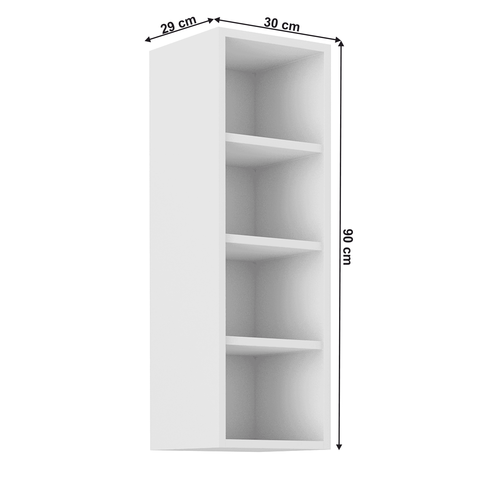 Dulap superior cu rafturi LULA 30 G-90 OTW Material: laminat DTD Culoare: albă Dimensiuni (LxAxÎ): 30x29x90cm Grosime material: 1,6 cm Cu rafturi, Fără uşă, Design dinamic modern, Livrat dezasamblat, Opţiunea de a cumpăra o chiuvetă universală LAY ON, Dulapurile inferioare sunt furnizate împreună cu şina inferioară, Fără blat de lucru. Opţiunea de a achiziţiona blat de lucru din stejar artizan stejar artizan la preţul de 399 lei/m sau marmură roma la preţul de 379 lei/m. Opţiunea de a achiziţiona o chiuvetă universală LAY ON.