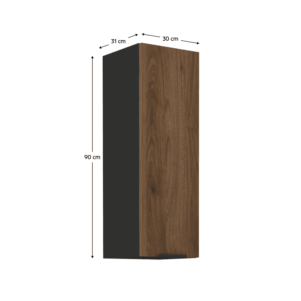 Material: DTD laminat Culoarea uşii: nuc okapi Culoarea dulapului: negru mat Dimensiuni (Lxlxh): 30x31x90 cm Grosime material: 1,6 cm Cu o uşă, Cu poliţă, Cu mâner metalic, Culoare mâner: aluminiu, Sistem de închidere silenţioasă a uşii, Design modern, Livrat dezasamblat, Dulapurile inferioare sunt furnizate împreună cu şina inferioară, fără blat de lucru. Opţiunea de a achiziţiona blat de lucru din marmură roma la preţul de 379,-/m. Opţiunea de a achiziţiona o chiuvetă universală LAY ON.