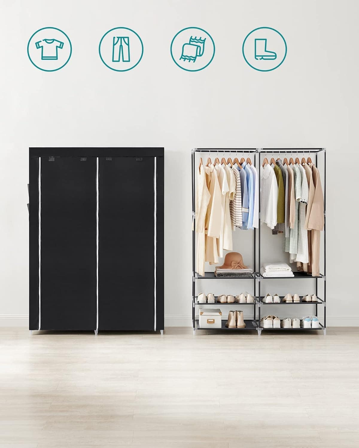 Dulap textil garderoba, 2 compartimente haine cu rafturi, cadru metalic, 127x45x176 cm, negru Mob360