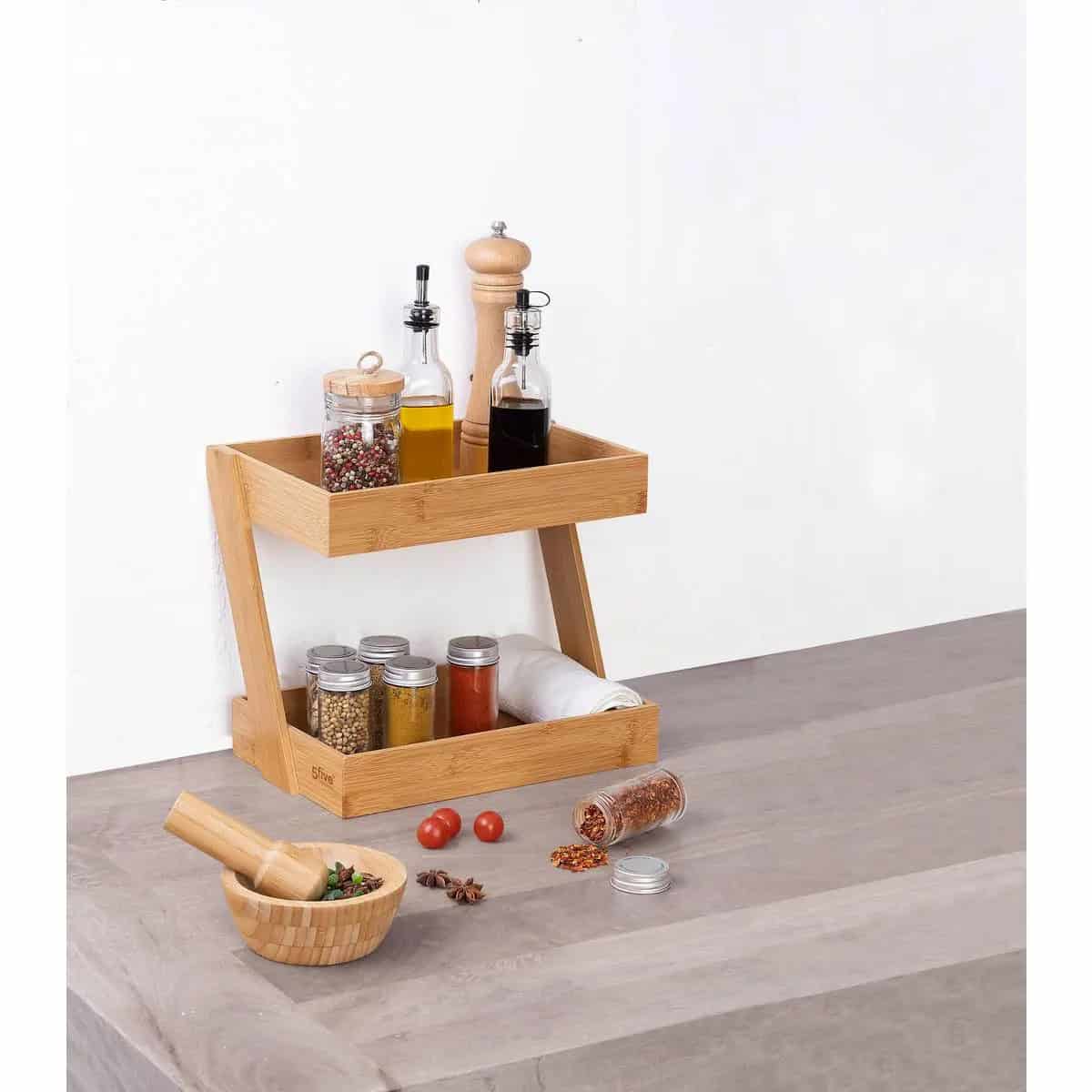 Etajera colt 5Five pentru bucatarie, 2 niveluri, bambus, 26x22x31cm, maro natural Mob360