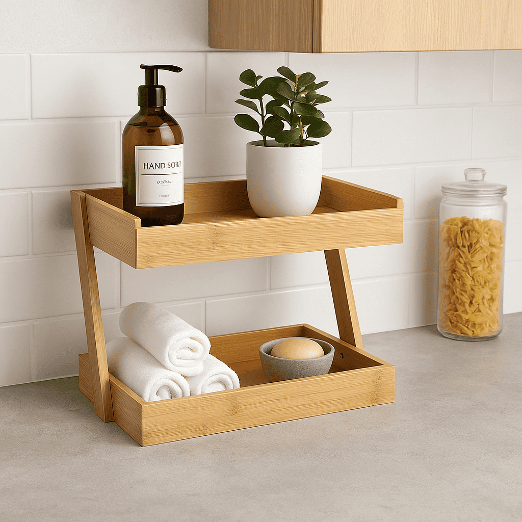 Specificatii tehnice Marca: 5Five Culoare: Maro natural Dimensiuni produs: L26 x P22,2 x H31,5 cm Material: Bambus Scurta descriere Etajera 5Five cu 2 niveluri din bambus este ideala pentru organizarea accesoriilor in baie, bucatarie sau pe birou. Fabricata din bambus natural, combina aspectul cald si natural cu functionalitatea moderna. Designul compact permite utilizarea eficienta a spatiului, adaugand o nota decorativa eleganta in orice incapere. Caracteristici principale Design practic cu doua rafturi Fabricata din bambus natural rezistent Finisaj neted, usor de curatat Perfecta pentru baie, bucatarie sau birou Usor de asamblat si integrat in decor