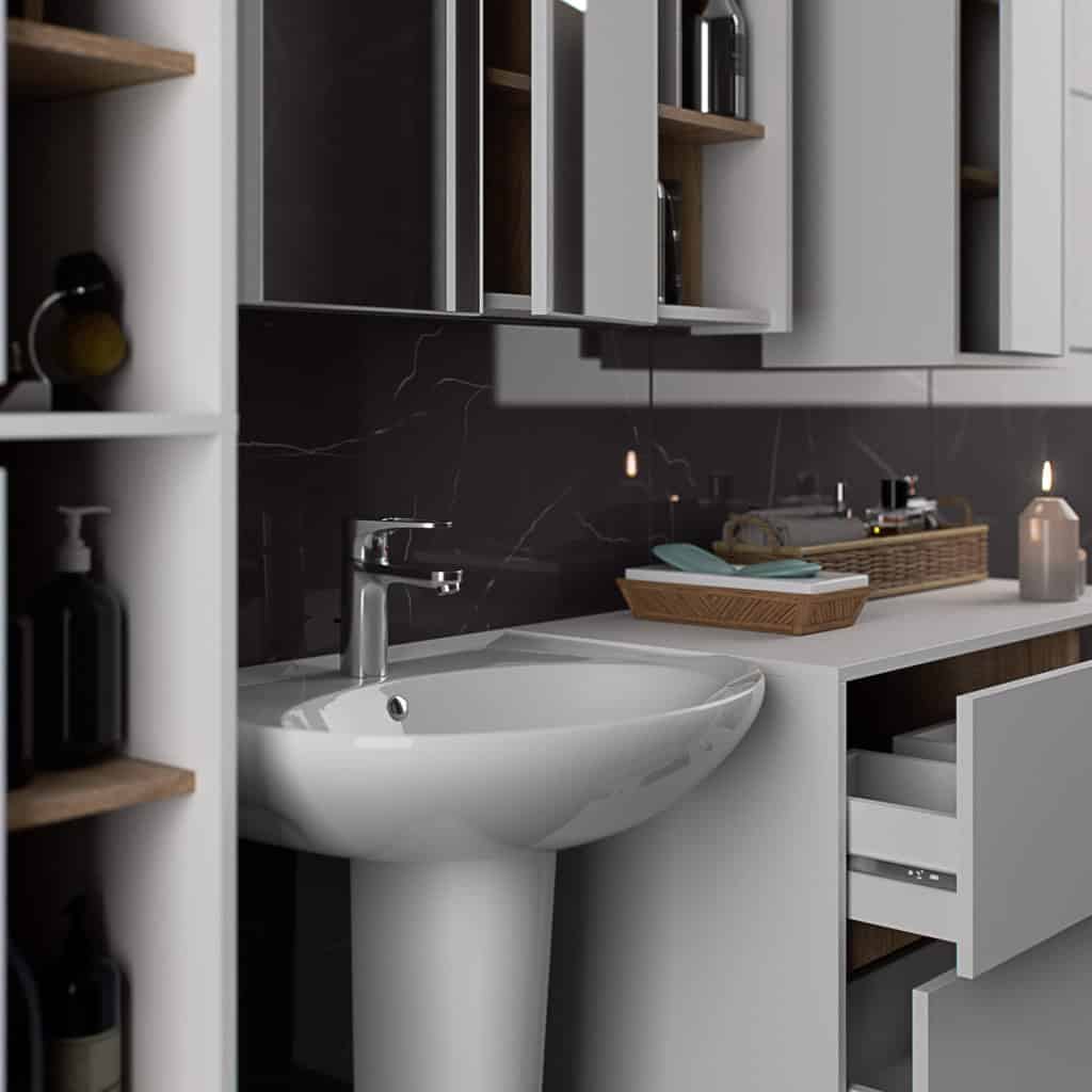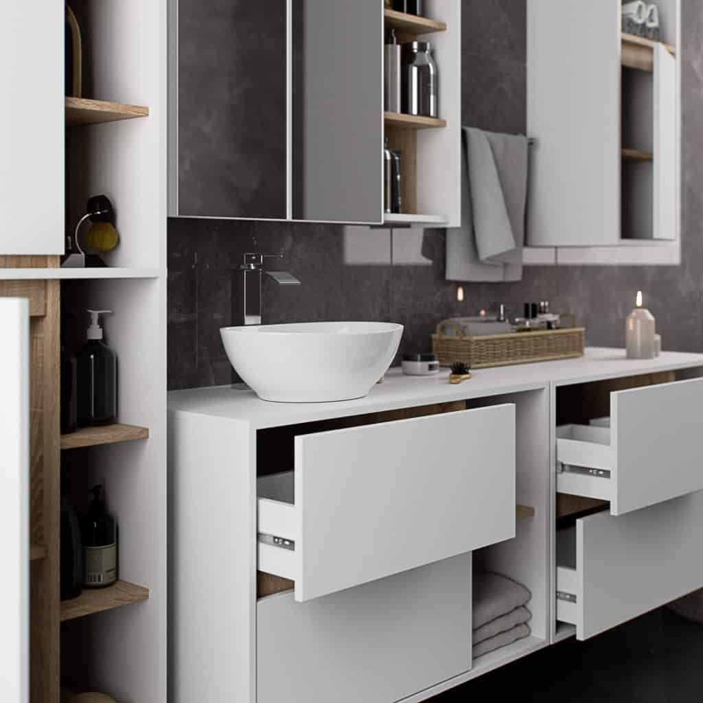 Etajera de baie suspendata, cu 2 sertare, PAL 16 mm, 90x46x60 cm, alb si stejar sonoma Mob360 – produs disponibil în magazinul Mob360.