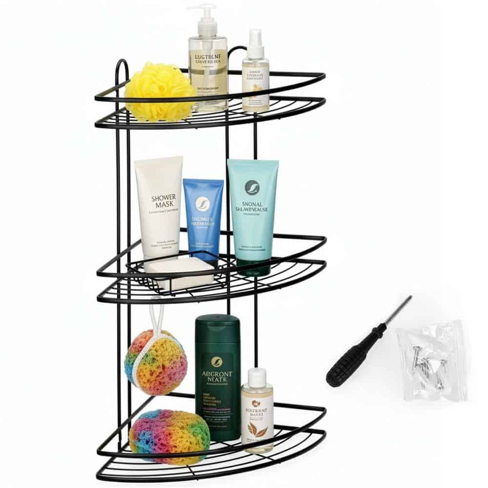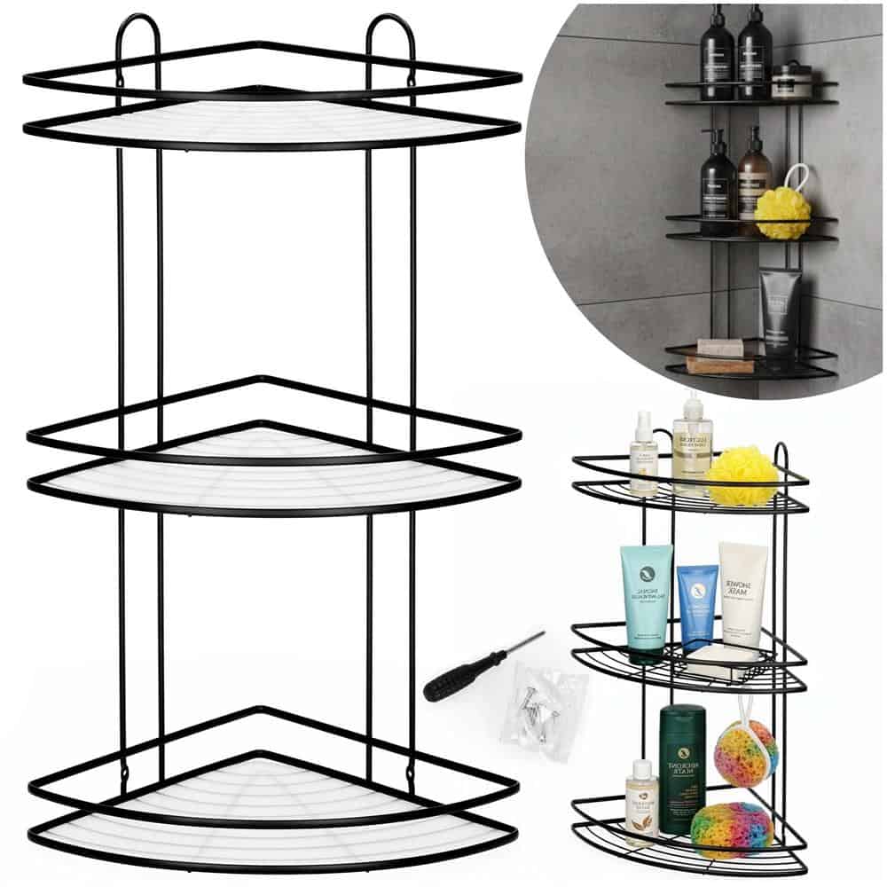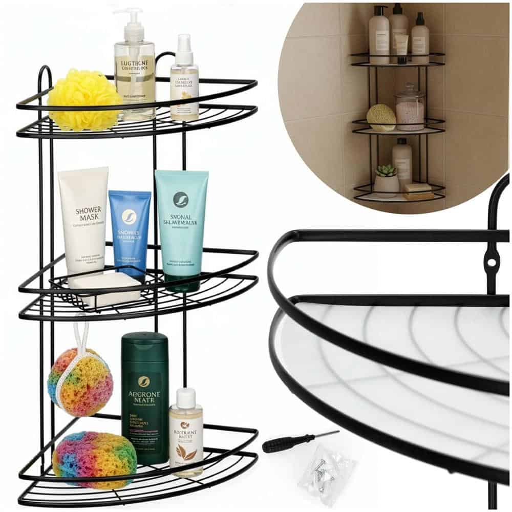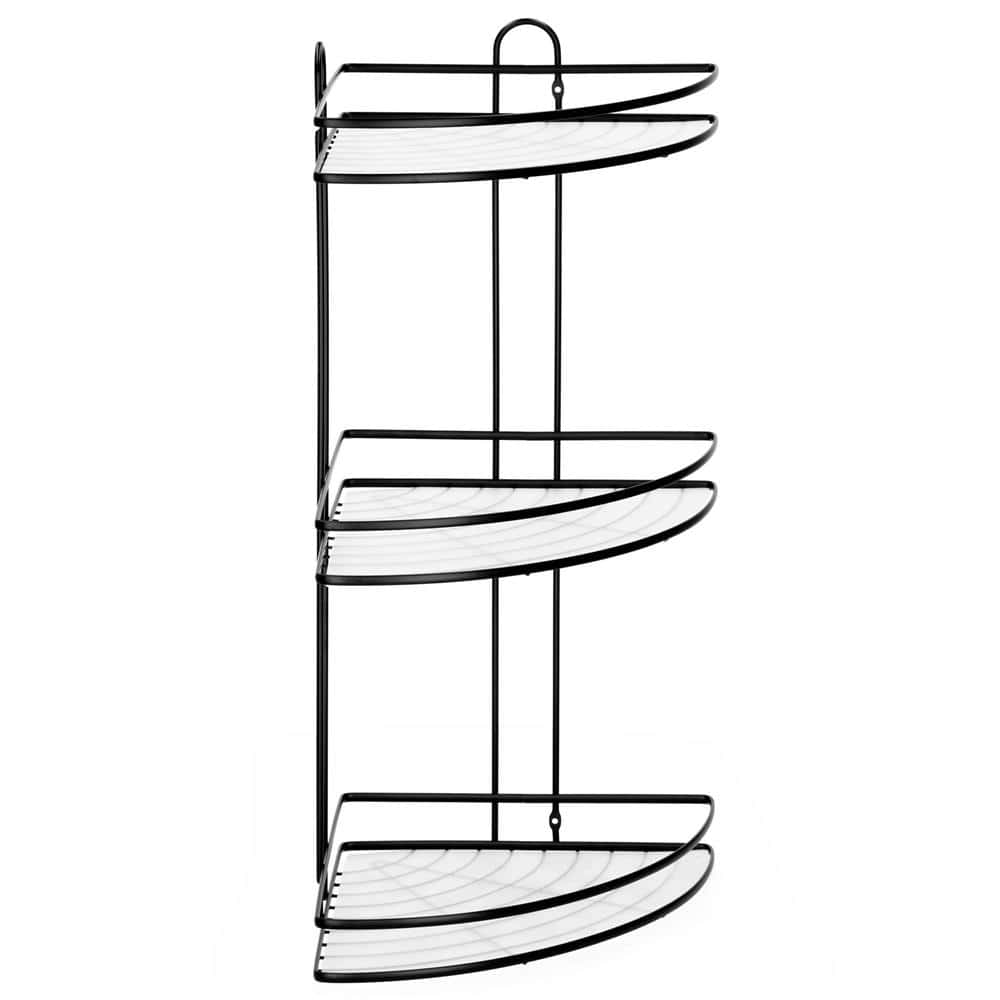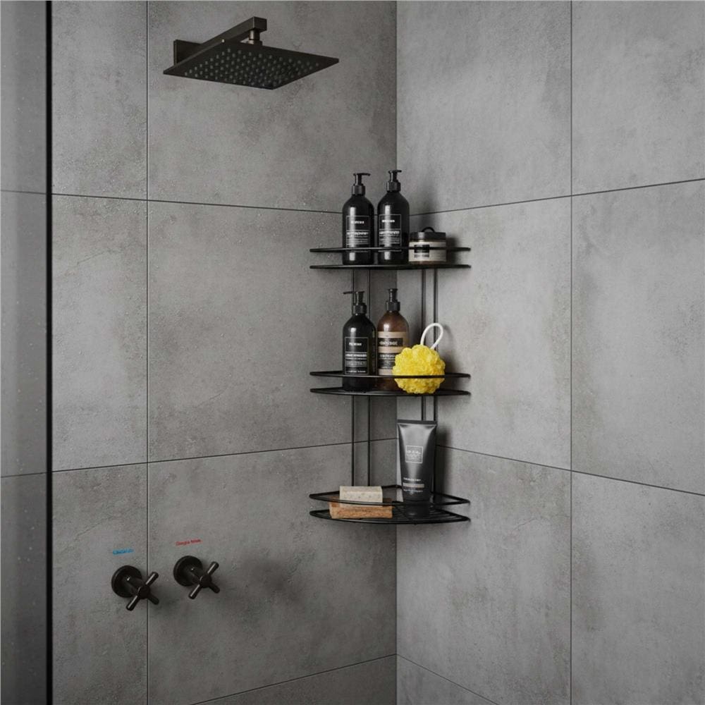 Etajera de colt pentru dus, cu 3 polite, montaj pe perete, inox, 25x25x59 cm, negru Mob360