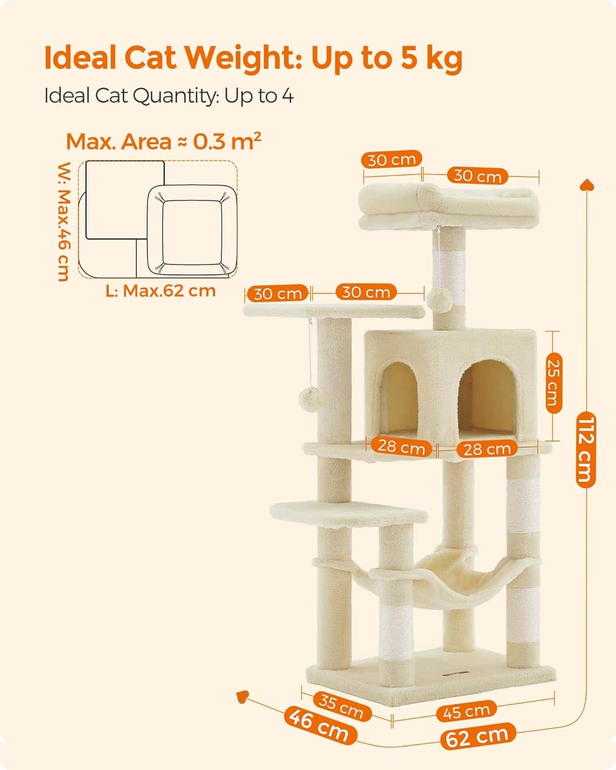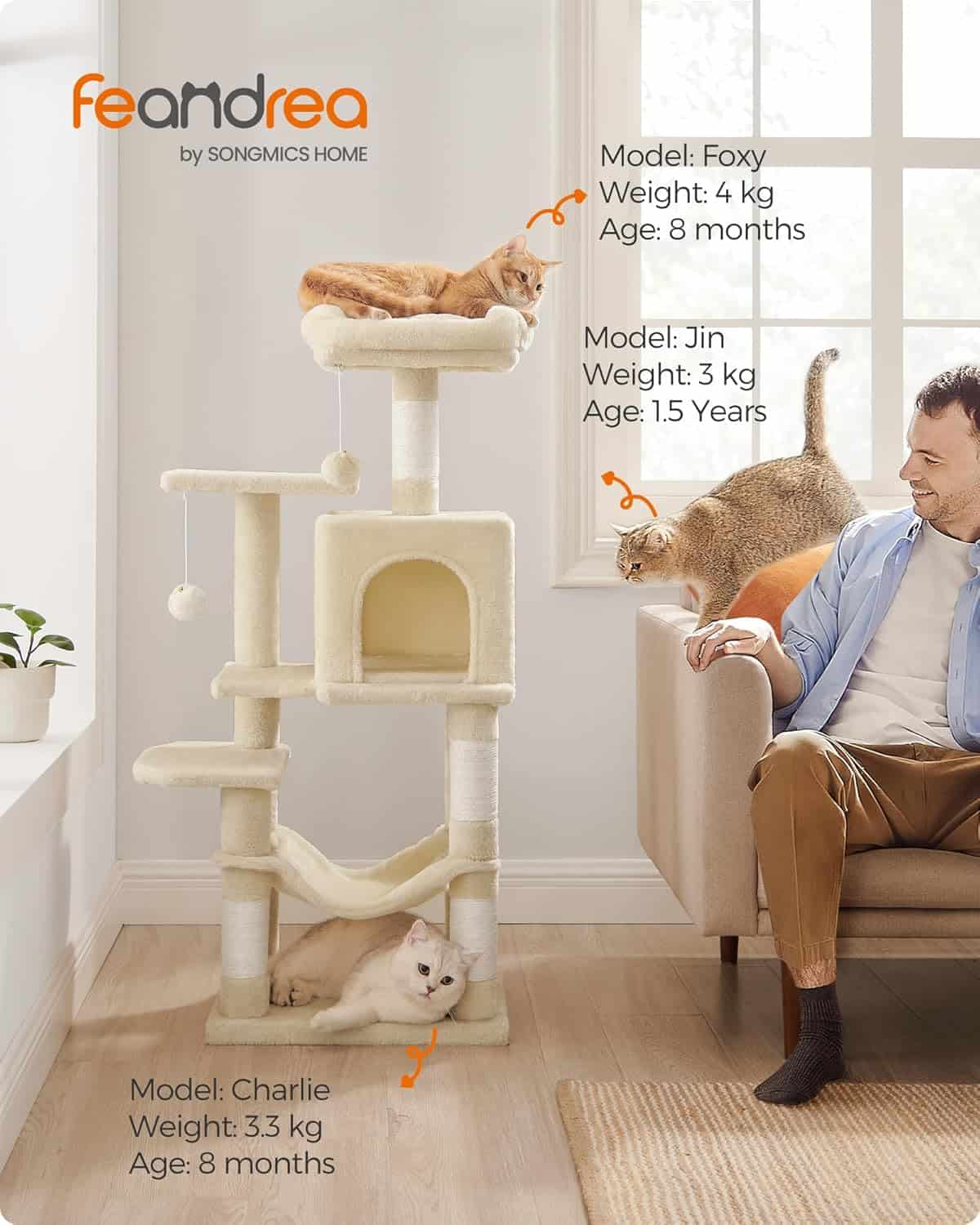 FEANDREA Ansamblu de joaca pentru pisici cu 2 platforme, 1 culcus, hamac si 4 stalpi sisal, 45x35x112 cm, bej Mob360