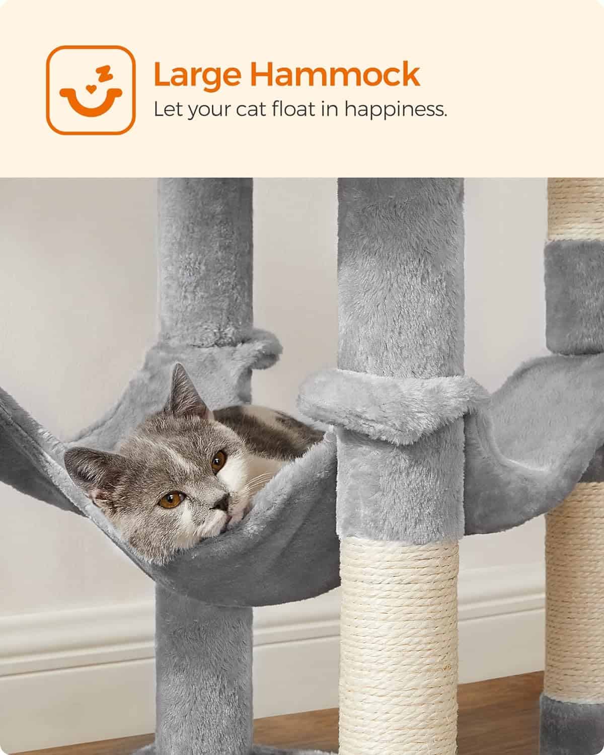 FEANDREA Ansamblu de joaca pentru pisici, tip copac, cu 1 culcus, 1 hamac si ascunzatoare, 55x45x143cm, gri deschis Mob360