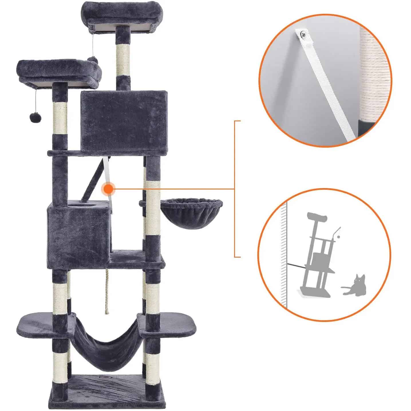 FEANDREA Ansamblu de joaca pentru pisici, tip copac, cu 3 culcusuri, hamac si 2 ascunzatoare, 60x50x206cm, gri inchis Mob360