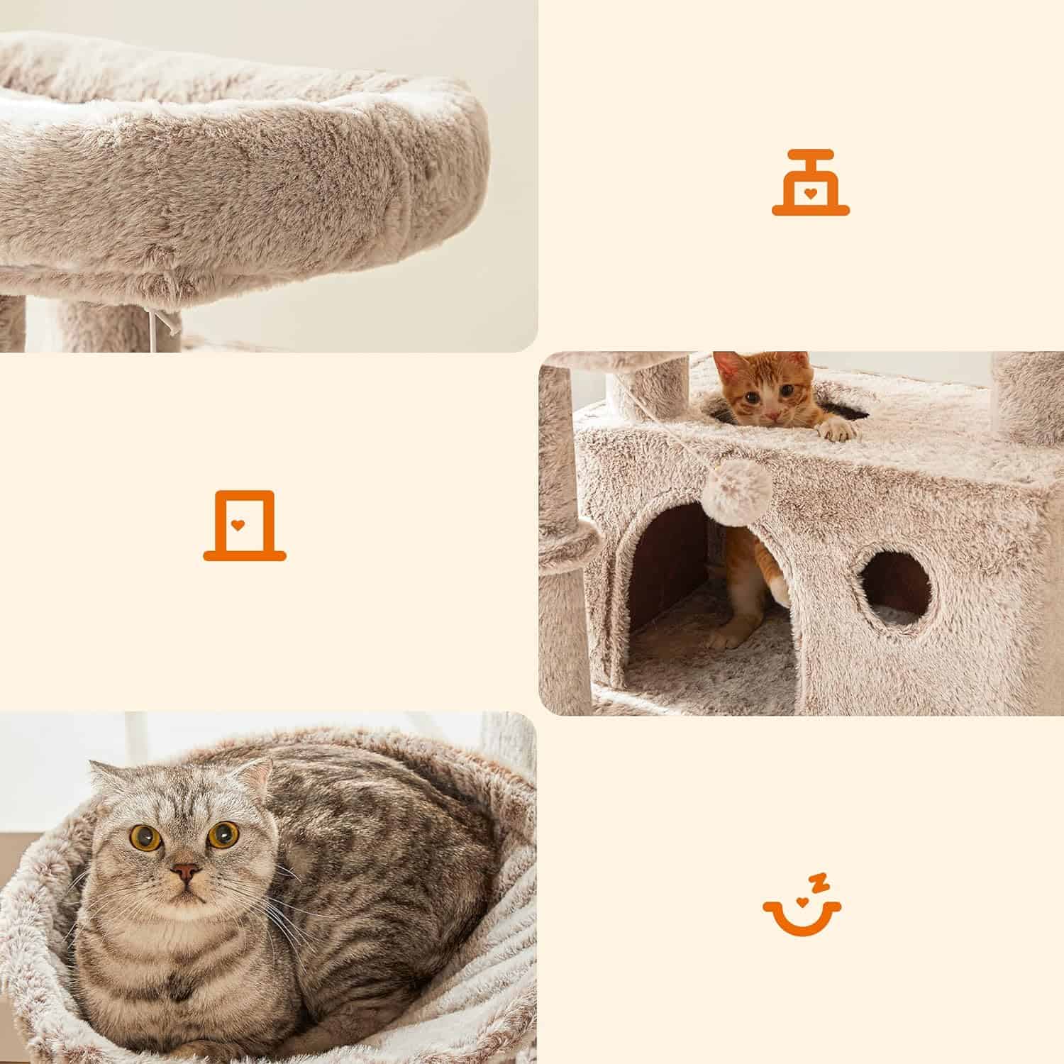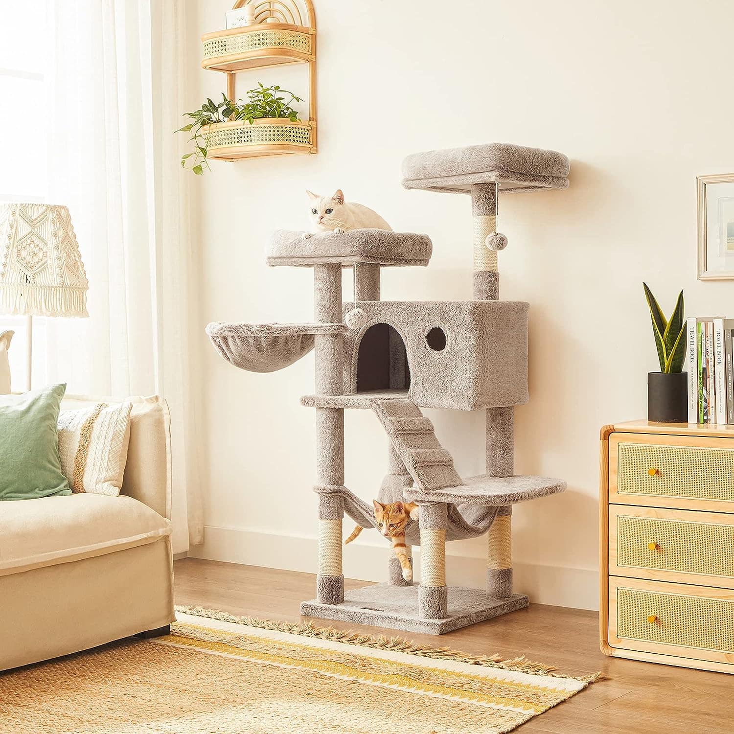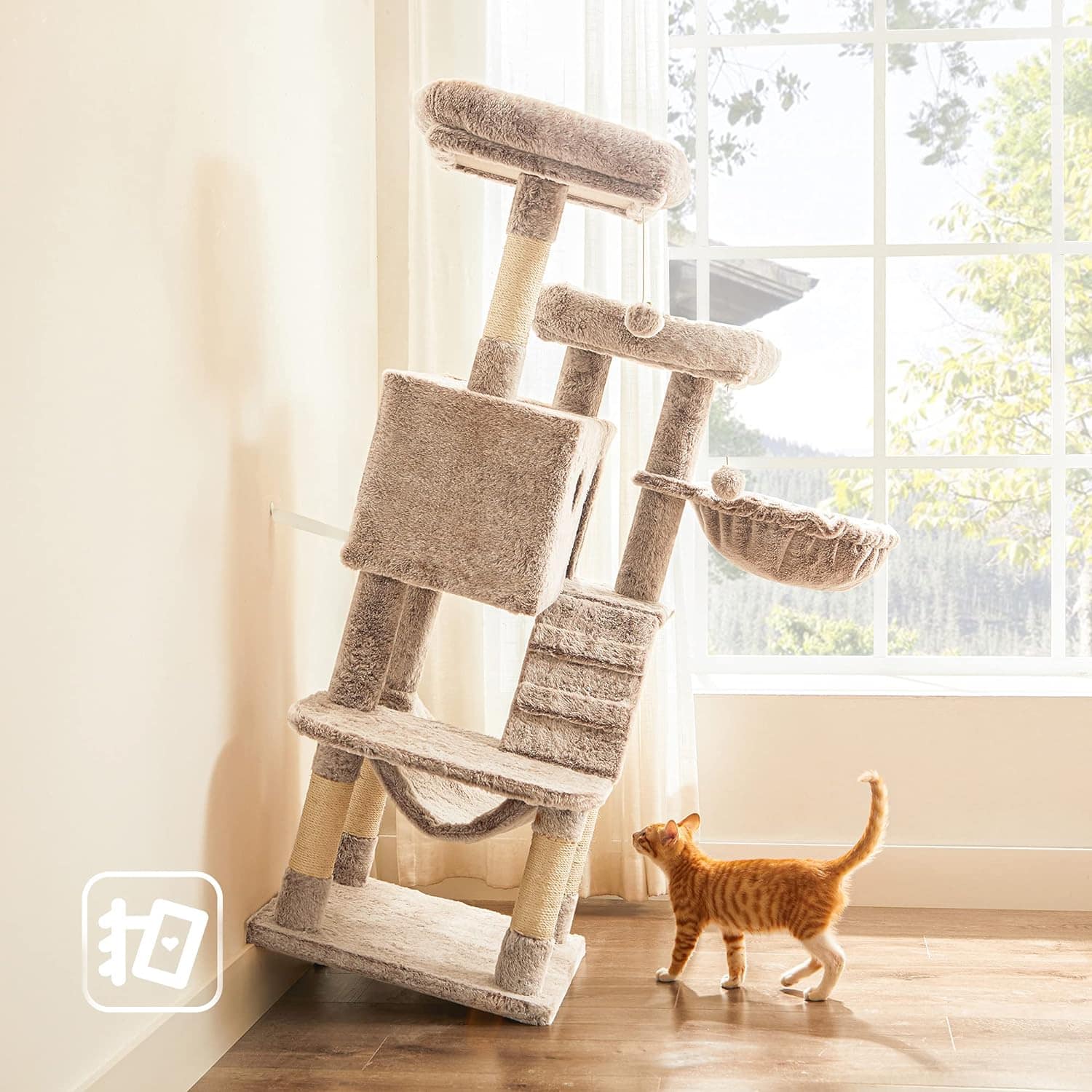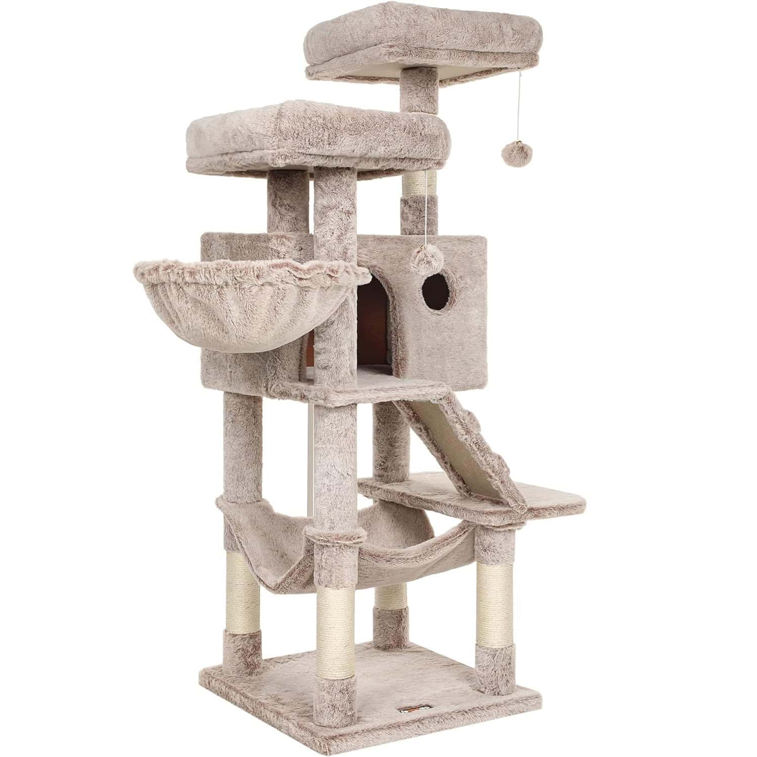 FEANDREA Ansamblu de joaca pentru pisici, tip copac, cu 3 culcusuri, hamac si ascunzatoare, 49x49x135cm, maro deschis Mob360