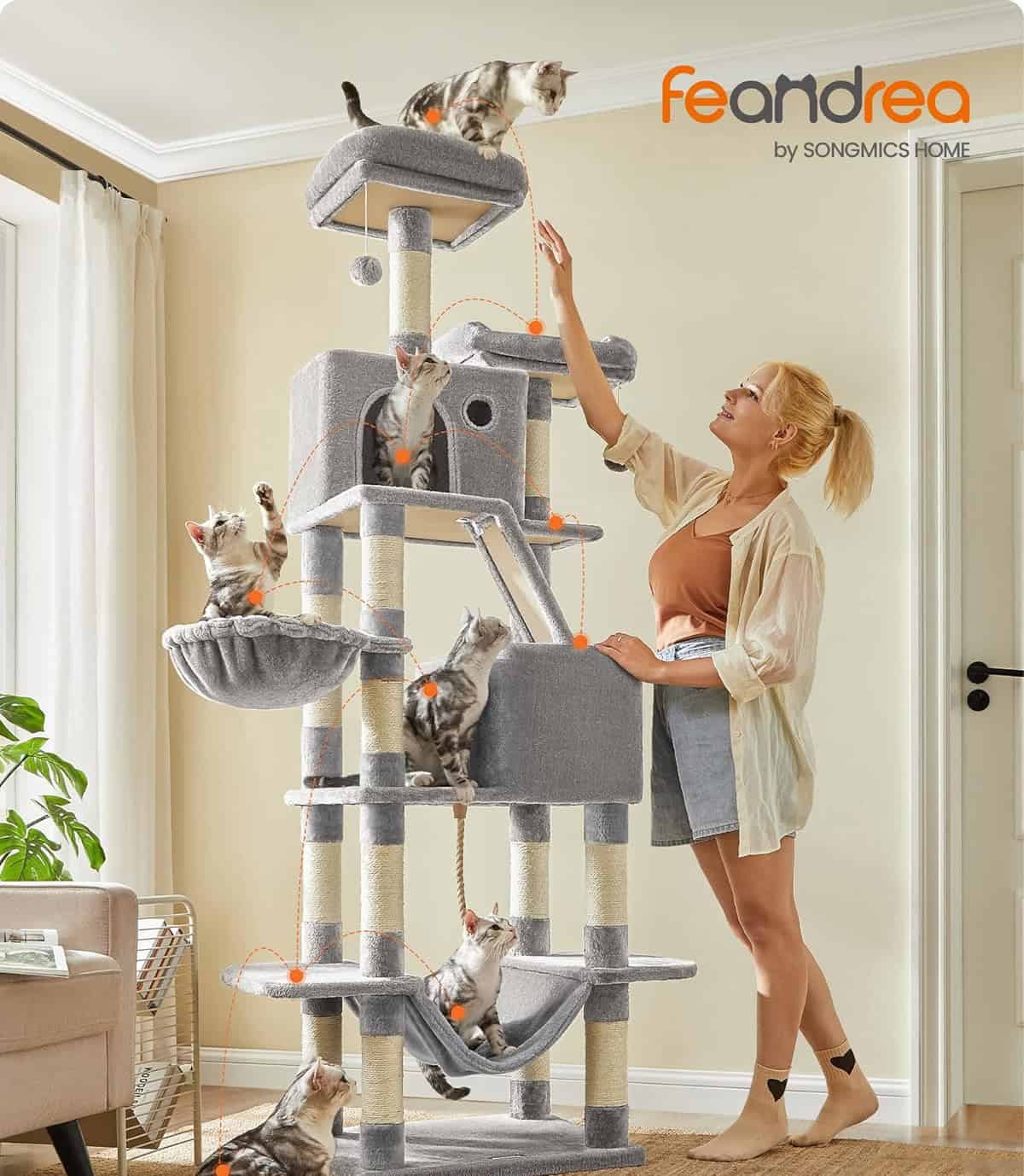 FEANDREA Ansamblu de joaca pentru pisici, tip copac, XXL, 13 stalpi de zgariat, 2 ascunzatori, 60x50x206cm, gri Mob360 – produs disponibil în magazinul Mob360.