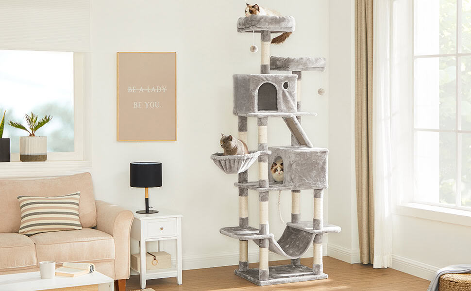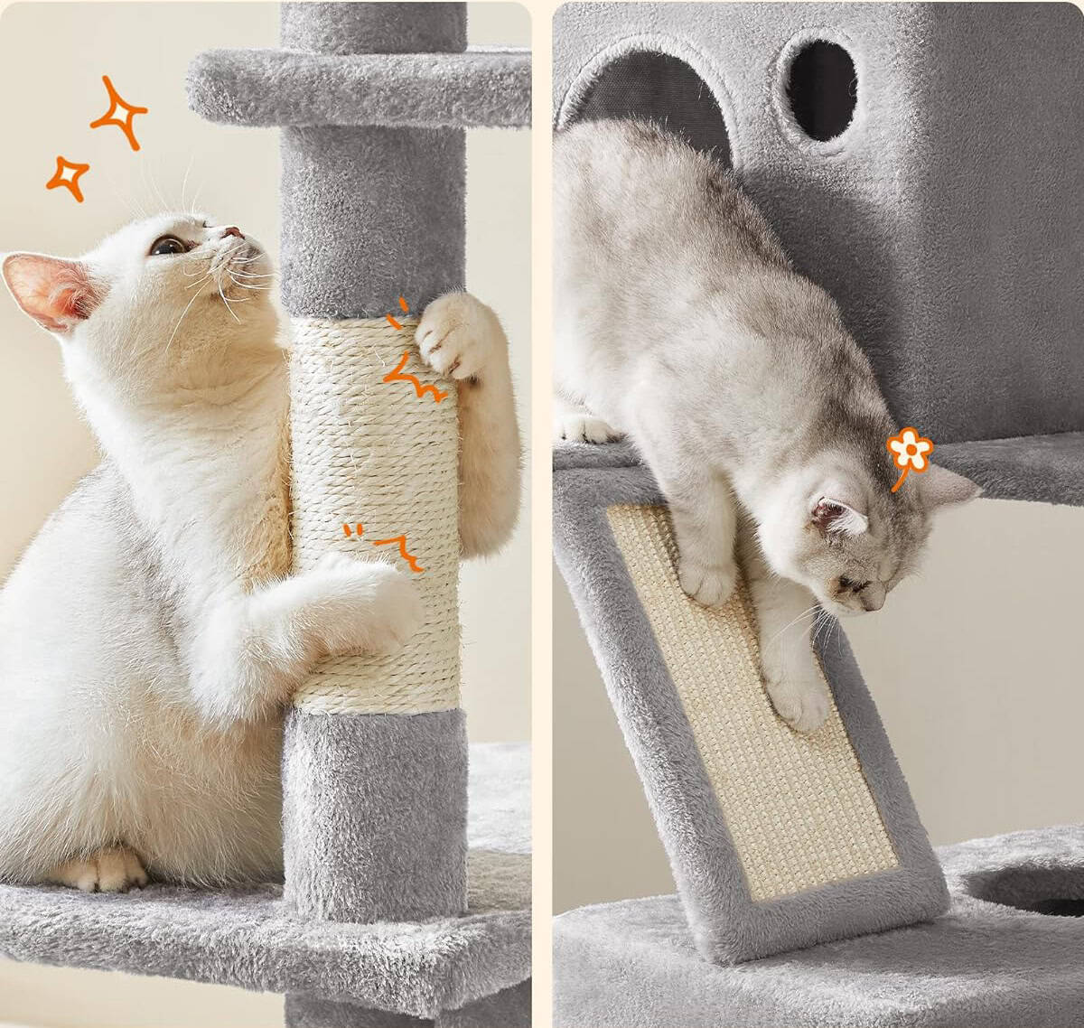 Detalii despre produs: Culoare: Gri deschis Material: Placi aglomerate din lemn, plus, sisal Dimensiuni: 60 x 50 x 206 cm (L x l x i) Despre acest articol 206 cm inaltime, distractie nesfarsita. 5 trepte: Distante scurte de 30-40 cm intre trepte. Acest ansamblu pentru pisici faciliteaza urcarea si coborarea si este perfect pentru pisicile carora le place sa se catere.Loc de joaca: Doua platforme bine captusite, doua vizuini de plus, un cos pufos, doua mingi de plus si un hamac. Fiecare pisica isi va gasi un loc preferat in acest ansamblu pentru pisici pe mai multe niveluri, perfect pentru familiile cu mai multe pisici. Datorita placii aglomerate de calitate, a bazei mari cu benzi intarite si a protectiei impotriva inclinarii, acest loc de joaca solid este potrivit pentru 6 pisici mari (7 kg fiecare).Usor de asamblat: Datorita structurii simple, a instructiunilor clare si a pieselor marcate, asamblarea acestui turn pentru pisici este o joaca de copii.Usor de curatat: Par, murdarie si firimituri – nu va faceti griji. Acestea sunt usor de curatat cu o rola de scame sau cu un aspirator.