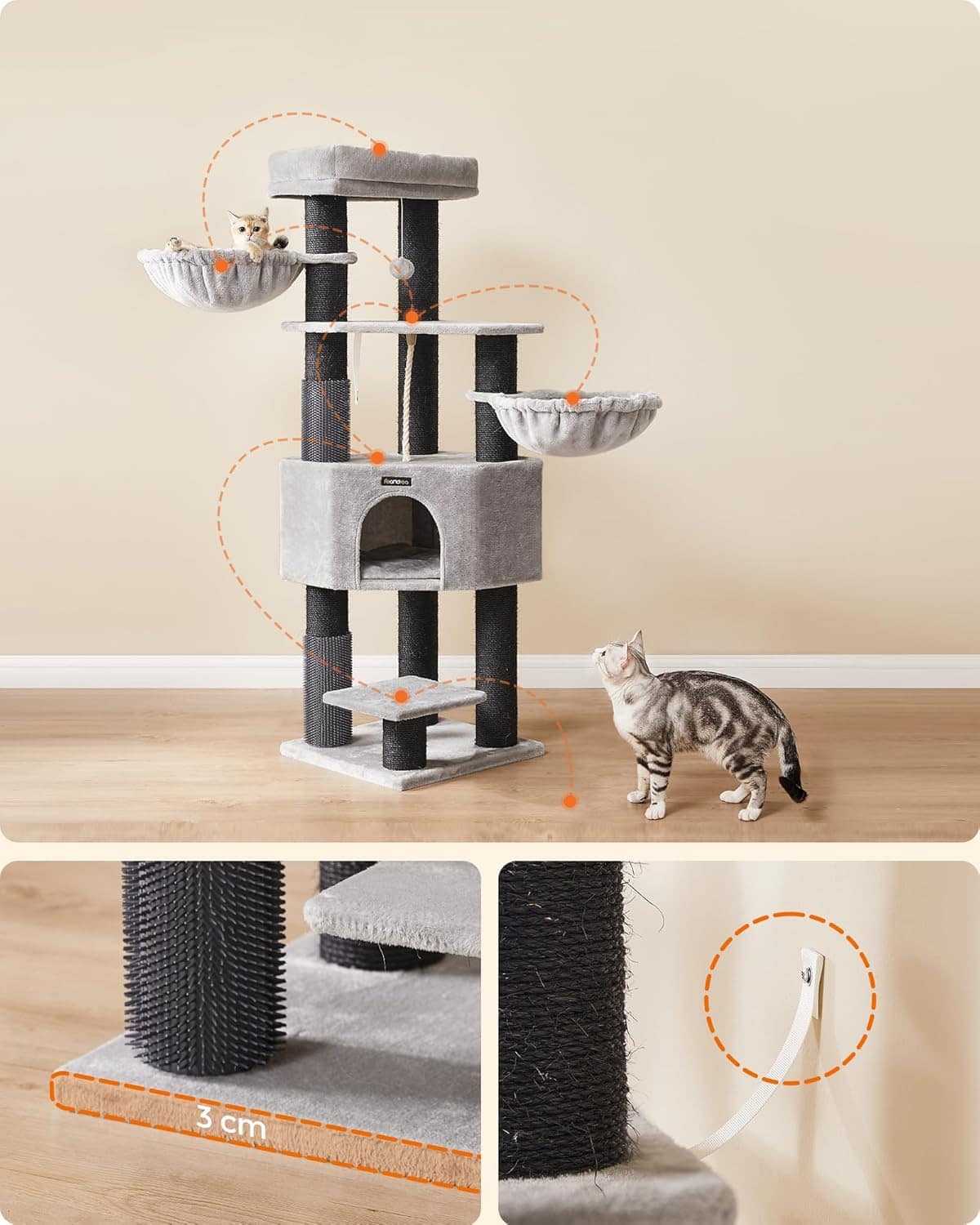 FEANDREA Ansamblu de joaca pisici, cu 9 stalpi de sisal, platforme mari si casuta, 50x50x160 cm, gri Mob360