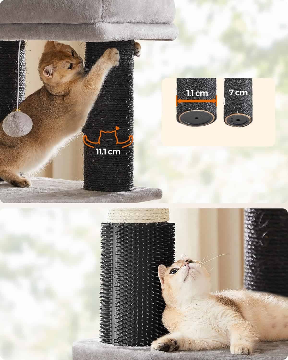 Specificatii tehnice: Brand: FEANDREA Material: PAL, plus, franghie sisal Dimensiuni produs: 50 x 50 x 160 cm (L x l x H) Culoare: Gri+ negru Numar stalpi zgariat: 9, cu diametru 11.1 cm Diametru sisal: 5.6 mm Capacitate maxima: 105 kg Numar recomandat de pisici: pana la 5 (fiecare ≤ 20 kg) Accesorii incluse: 1 minge din plus cu clopotel, 2 perii, patura lavabila, sistem anti-inclinare Scurta descriere: Rasfata-ti felinele cu un ansamblu de joaca gandit special pentru pisici mari. Cu stalpi grosi acoperiti cu sisal, perii de masaj, paturi auto-incalzite si zone variate de relaxare, acest model ofera confort si activitate in siguranta. Platformele mari si stabilitatea crescuta il fac ideal pentru pisici active si curioase. Caracteristici principale: 2 paturi auto-incalzite – pastreaza caldura corpului pisicii 9 stalpi grosi cu sisal pentru zgariat intens 2 perii laterale pentru masaj si ingrijire Casuta spatioasa de 50x50x30 cm pentru somn 2 sezlonguri cu diametru 40 cm Platforma superioara captusita pentru observatie Baza ranforsata si sistem anti-inclinare inclus Jucarie suspendata si funie pentru joaca zilnica Ideal pentru pana la 5 pisici de talie mare Usor de curatat, paturile sunt detasabile si lavabile