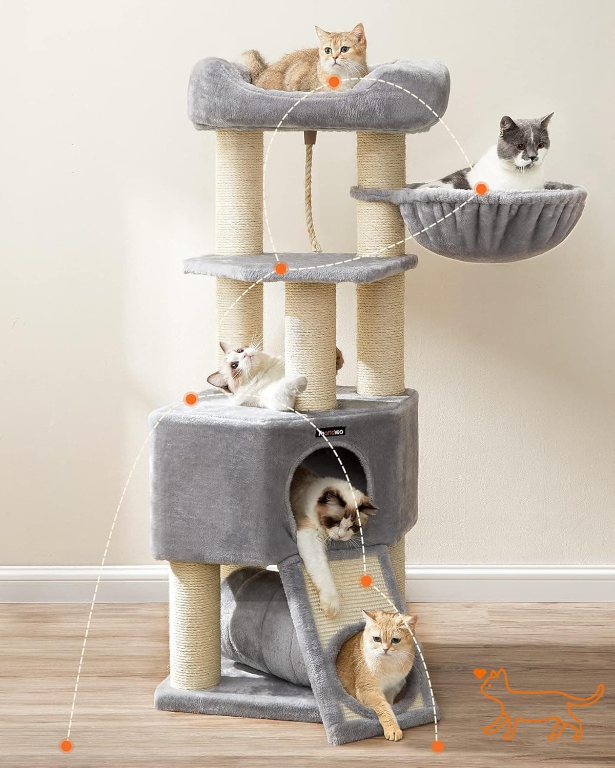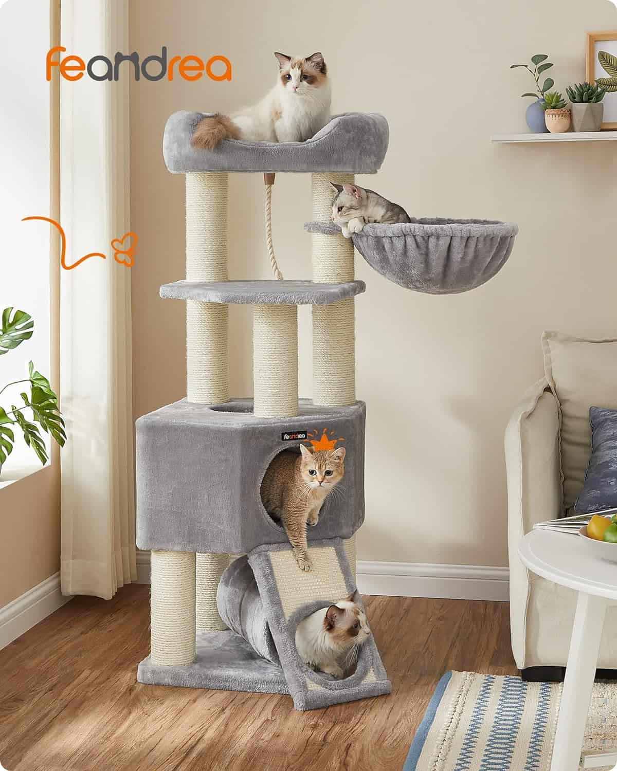 FEANDREA Ansamblu de joaca pisici, tip copac, pentru pisici de dimensiuni mari, 50x50x141 cm, gri Mob360 – produs disponibil în magazinul Mob360.
