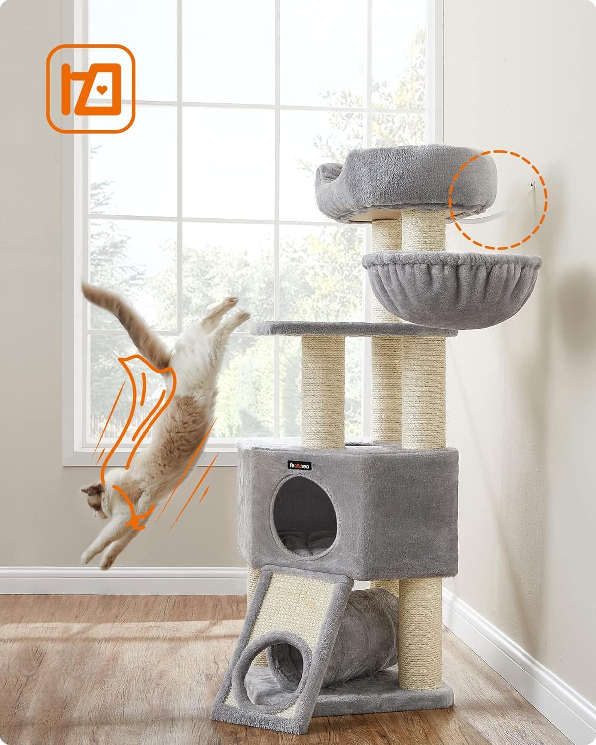 In atelierul creativ FEANDREA, 2 pisicute adorabile alearga aici, controleaza calitatea arborilor pentru pisici si ne permit sa judecam calitatea pentru a va oferi cel mai bun produs posibil. In acest fel, inginerii echipei de cercetare si dezvoltare FEANDREA colecteaza informatii de prima mana si incearca sa indeplineasca cerintele prietenilor nostri felini. De ce sa alegeti acest copac pentru pisici FEANDREA? O multime de spatiu: Dimensiunea totala este de 50 x 50 x 141 cm, cu o platforma mare, un hamac larg si o nisa spatioasa Baza de 50 x 50 cm, stalpii grosi cu diametrul de 11,5 cm, materialele de calitate si kitul anti-basculare inclus asigura o stabilitate perfecta. Potrivit pentru pisoi si pisici in varsta: Nivelurile si tabla de zgariat le faciliteaza urcarea si coborarea. Moale si confortabila: Acoperit cu tesatura de plus pentru mai mult confort. O varietate de placeri: 1 platforma, 1 hamac, 1 nisa, 1 franghie de agatat din sisal, 1 tunel, mai multe posturi din sisal si 1 post de zgariat. Usor de asamblat: Cu piese numerotate, instructiuni ilustrate si un instrument de asamblare, acesta poate fi asamblat rapid si usor de catre o singura persoana Caracteristici: Culoare: Gri deschis, culoare lemnoasaMaterial: Placi aglomerate, tesatura plusata, sisalDimensiuni: 50 x 50 x 141 cm (L x l x i)Greutate: 22,3 kgCapacitate de incarcare statica maxima totala: 83 kgNumar recomandat de pisici: ≤ 5 (greutatea fiecarei pisici ≤ 10 kg). FEANDREA Precautii: Va rugam sa plasati acest arbore pentru pisici pe o suprafata plana si impotriva peretelui. Din motive de siguranta, este foarte recomandabil sa il fixati pe perete cu dispozitivul anti-basculare inclus. Va rugam sa nu utilizati acest arbore pentru pisici intr-un mediu umed. Este interzis copiilor sa se urce pe produs si sa se joace cu el. Spatiu XXL Acest copac pentru pisici este echipat cu o platforma mare de 50 x 50 cm, o cusca mare de 50 x 50 x 30 cm si un hamac XXL de 40 cm. Este potrivit in special pentru pisici mari Robust si stabil Cu o baza mare de 50 x 50 cm, stalpi grosi cu un diametru de 11,5 cm si bare de armare, acest turn de joaca este stabil chiar si atunci cand pisicile dvs. topaie. Kitul de inclinare il fixeaza la perete pentru si mai multa siguranta Pentru maxim 5 pisici Acest mobilier pentru pisici suporta pana la 83 kg in total. Cu mai multe niveluri, pisicile dvs. pot servi casa pe platforma, pot trage un pui de somn in hamac sau pot zgaria pe stalpii din sisal si pe stalpul de zgariat Usor de curatat si asamblat Capacul platformei de observatie este detasabil si lavabil. Toate suruburile sunt identice, chiar nu este nevoie sa le diferentiati. Asamblarea se face de catre o singura persoana folosind cheia Allen furnizata Loc de joaca, distractie fara sfarsit Cu placa de zgariat cu o gaura, franghie sisal agatata, hamac si platforma, acest copac pentru pisici ofera distractie fara sfarsit pentru prietenii dvs. felini