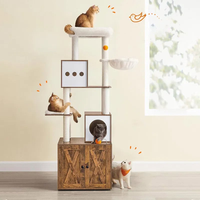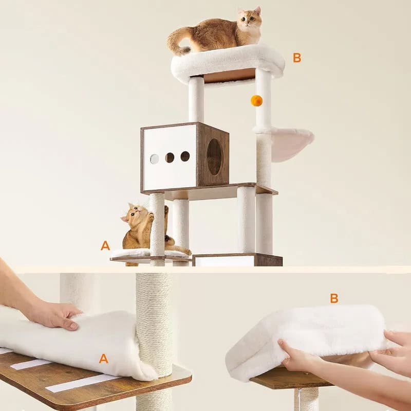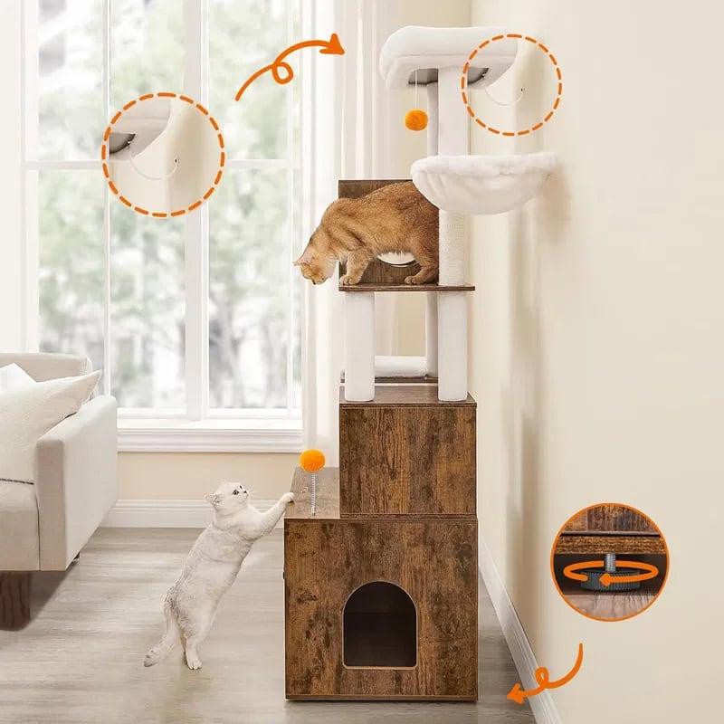 - Ansamblul pentru pisici este o solutie completa pentru confortul si distractia animalului tau. Include atat zone de joaca si odihna, cat si un dulap discret pentru litiera, economisind spatiu si mentinand un aspect ordonat in locuinta. Designul pe mai multe niveluri permite pisicii sa se catere, sa observe si sa se relaxeze in voie. Caracteristici principale: