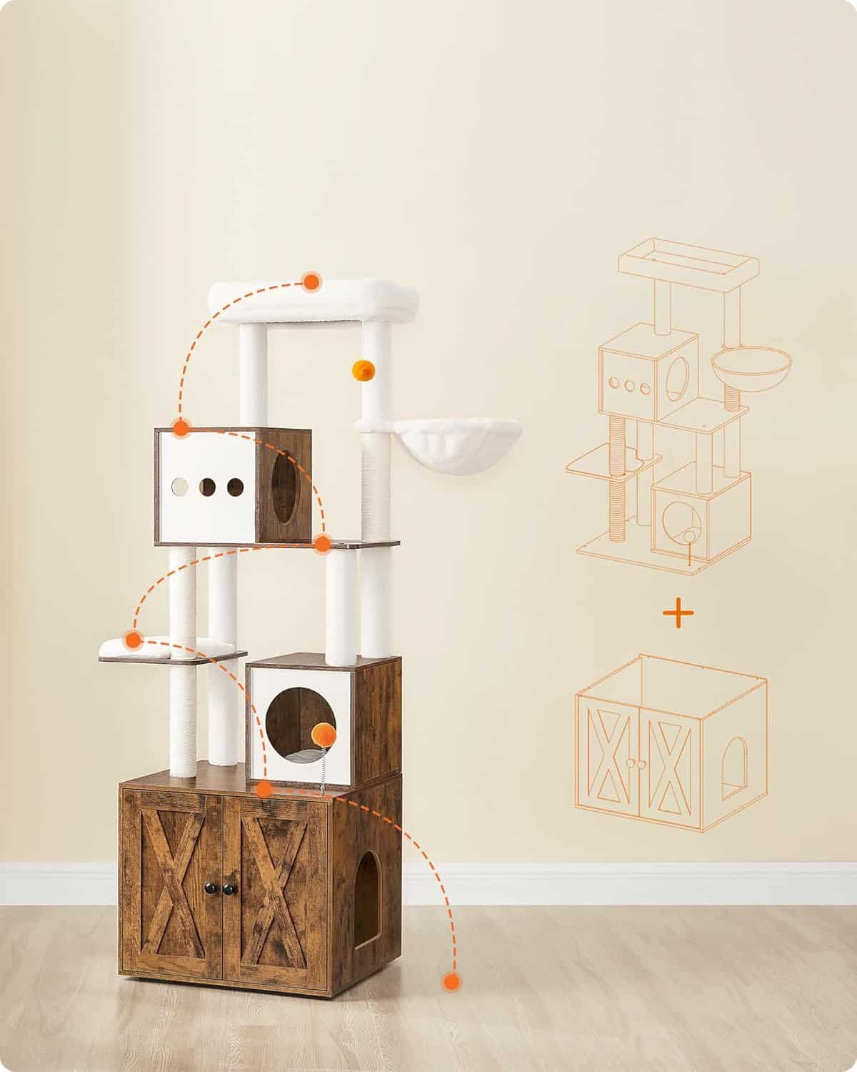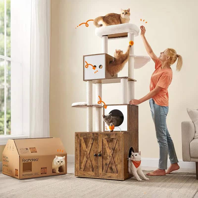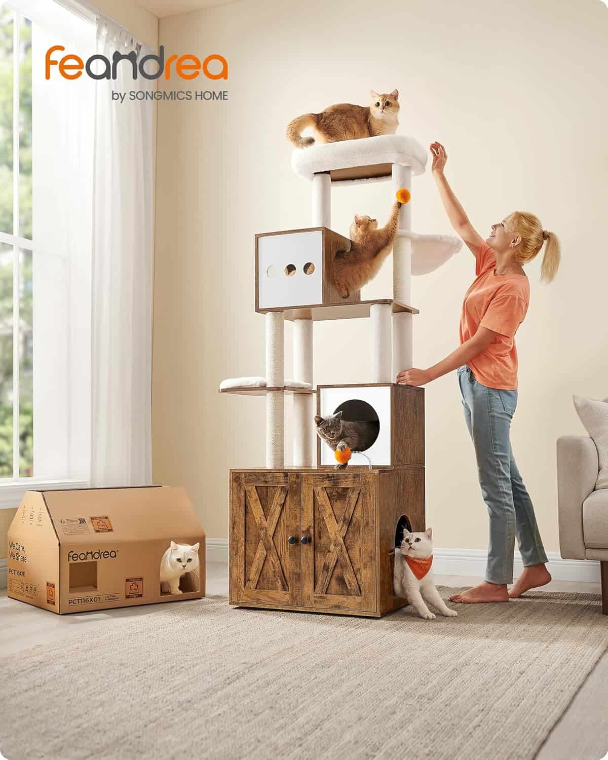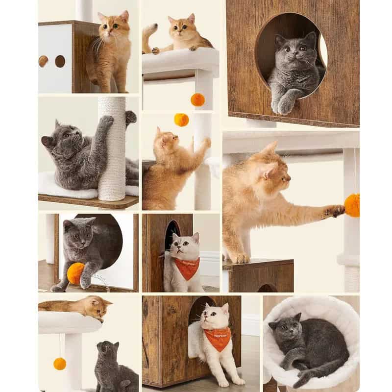 FEANDREA Ansamblu pentru pisici din PAL, plus si sisal, cu dulap litiera, 185 cm, platforme multiple, perne lavabile, maro rustic Mob360