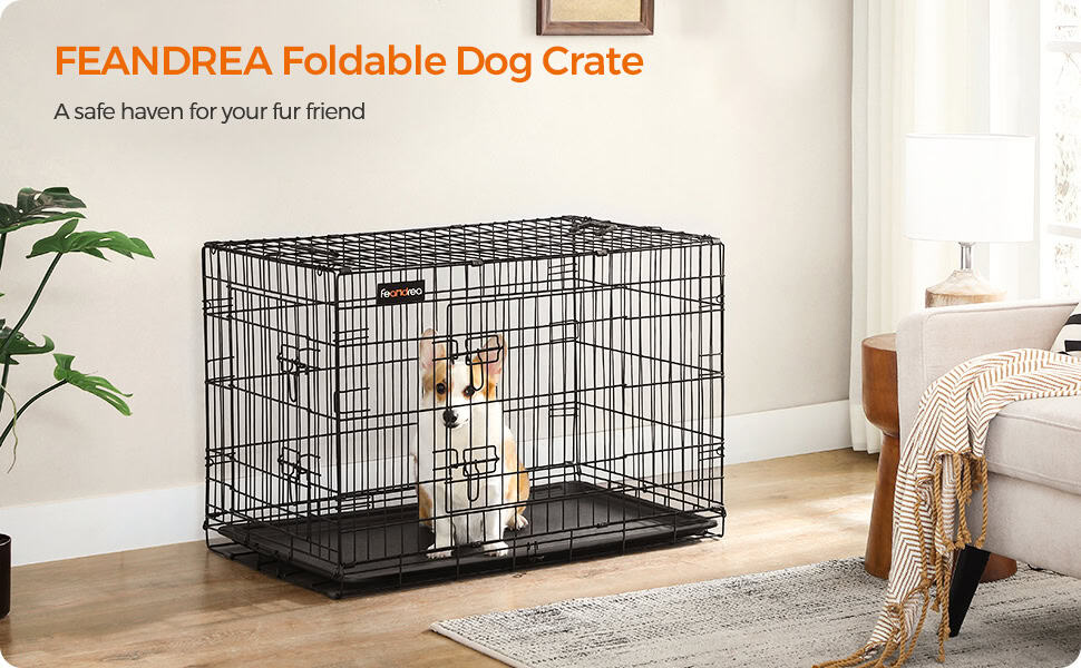 Usor de curatat: Lada pliabila pentru caine vine cu o tava extrasa in partea inferioara, astfel incat sa o poti glisa cu usurinta pentru a curata si sa pastrezi locul cainelui curat – prietenul tau cu blana iti va multumi pentru asta! FEANDREA Cusca pentru animale, 2 usi, pliabila din metal, tava detasabila, L, 93x58x64cm, negru Mob360 este disponibil în magazinul Mob360.