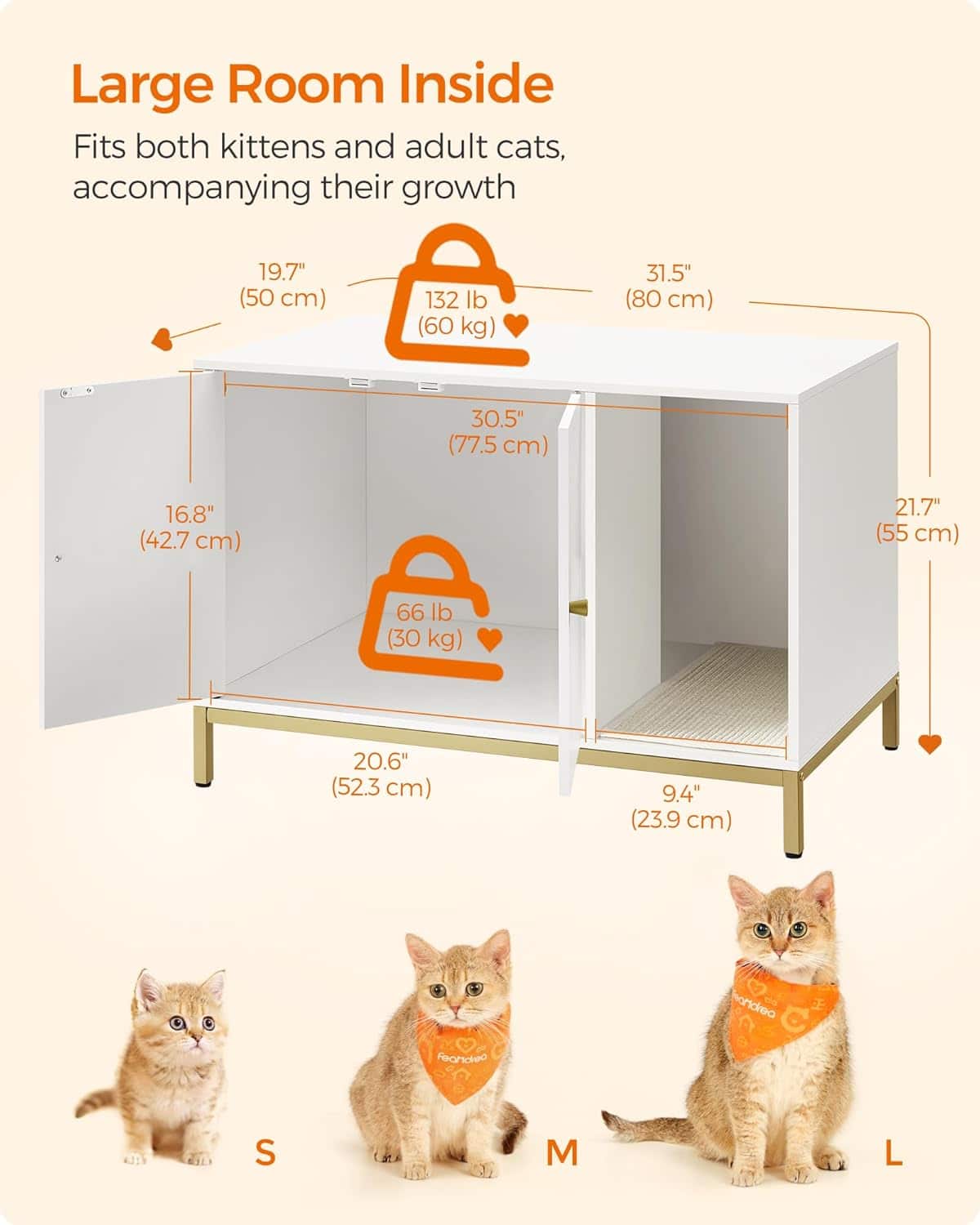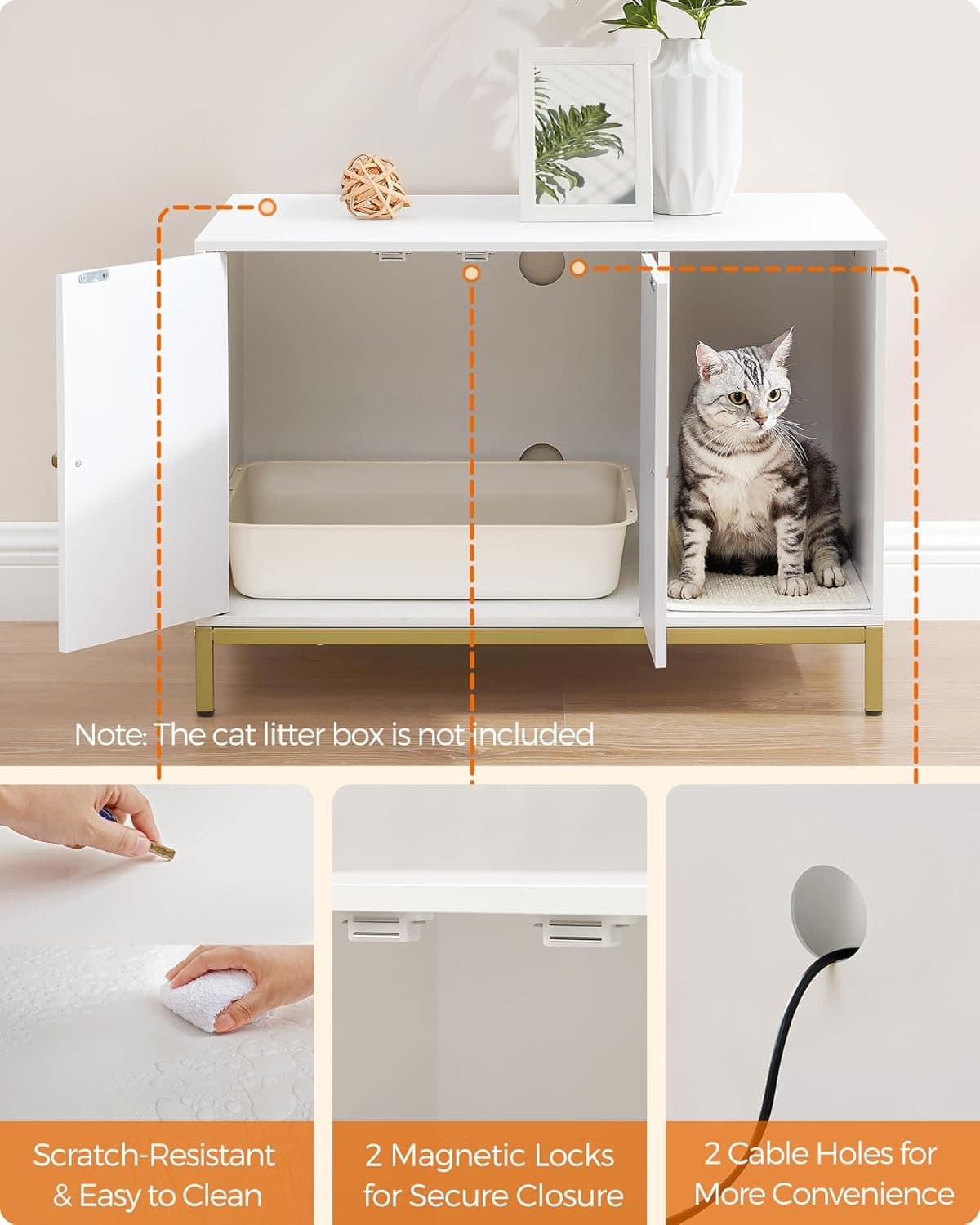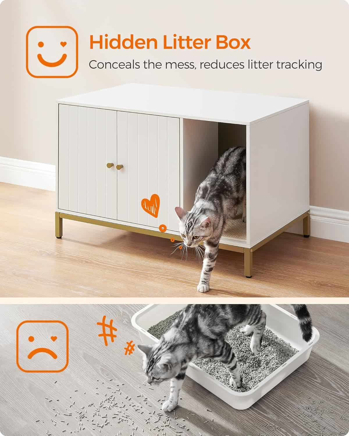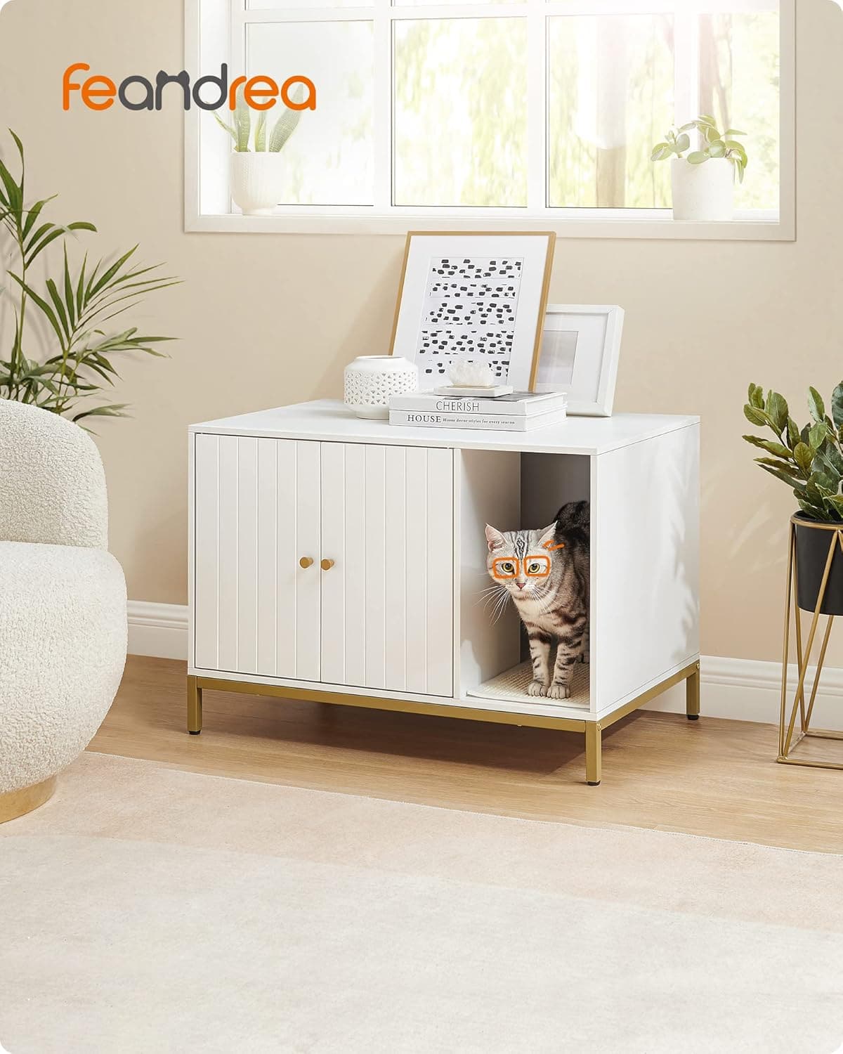 FEANDREA Dulap mascat pentru litiera pisici, cu cadru metalic auriu, 80x50x55 cm, alb Mob360